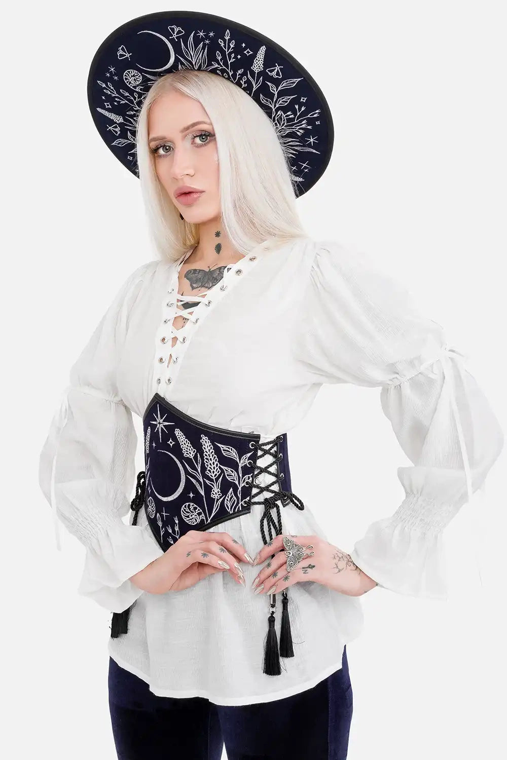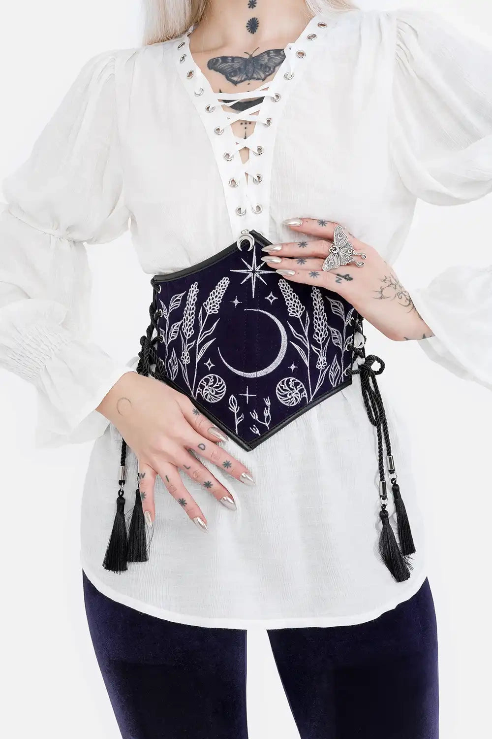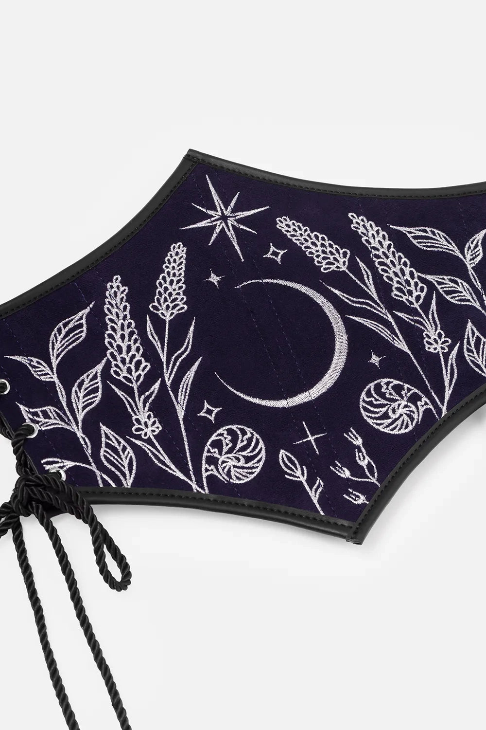 A fantasy corset belt for whimsigoth and dark fairycore outfits. Navy blue suede under-bust belt with shimmering silver embroidery, moonlit motifs, and celestial charm - perfect to accentuate your waist and complete magical, ethereal looks. Elevate gothic or boho-inspired ensembles with this mystical waist accessory.