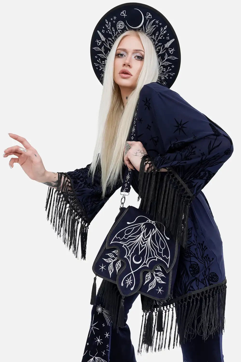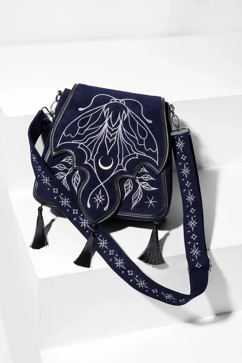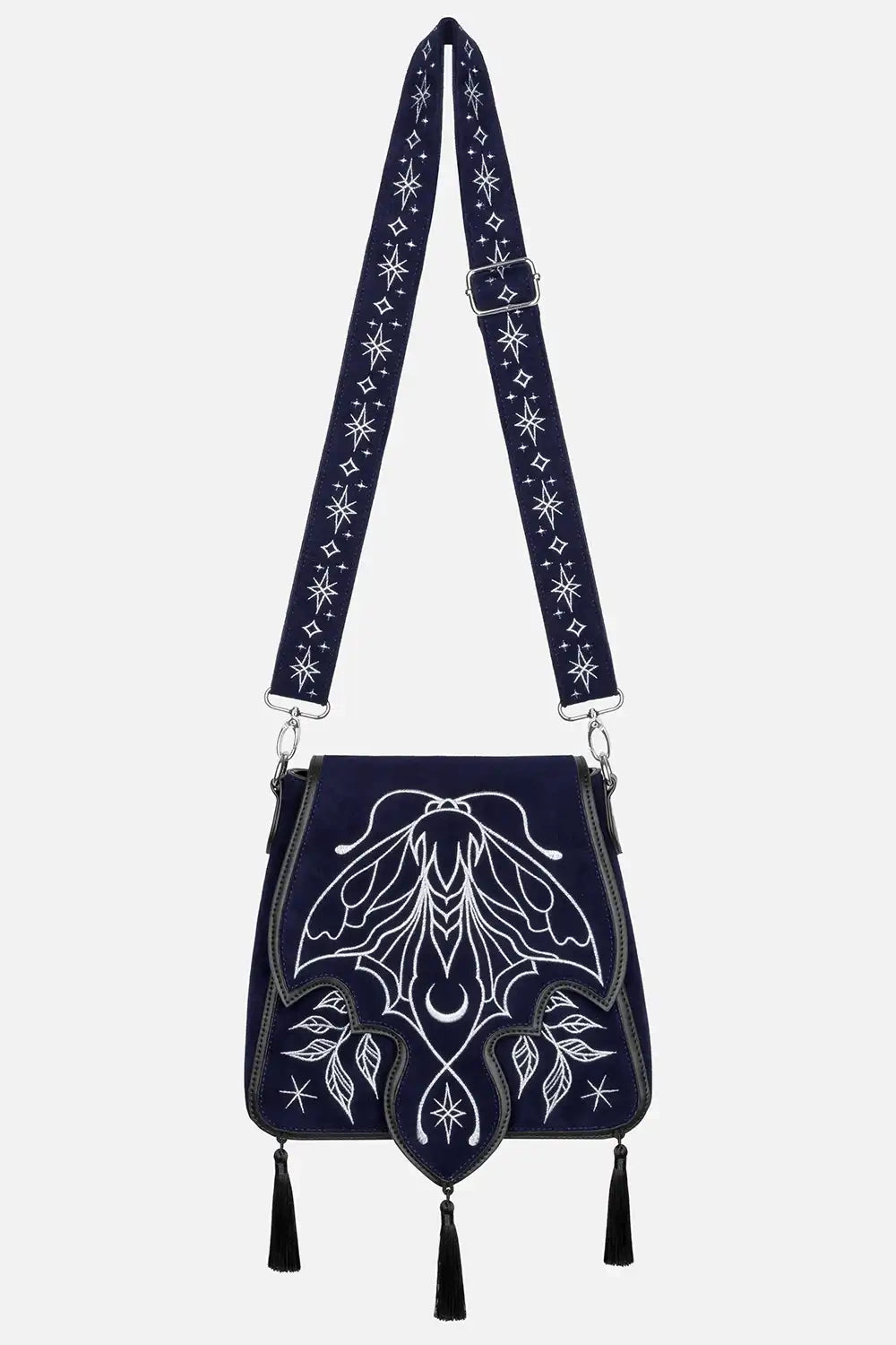 A dark blue faux suede bag inspired by the rich, mysterious depths of the night sky. The large luna moth embroidery, outlined in shimmering silver thread, glimmers like starlight, surrounded by stars, a crescent moon, and delicate botanical motifs along the bottom. This tassel shoulder bag with front flap brings a magical, whimsical touch to any outfit, perfect for celestial or dark fairycore looks.