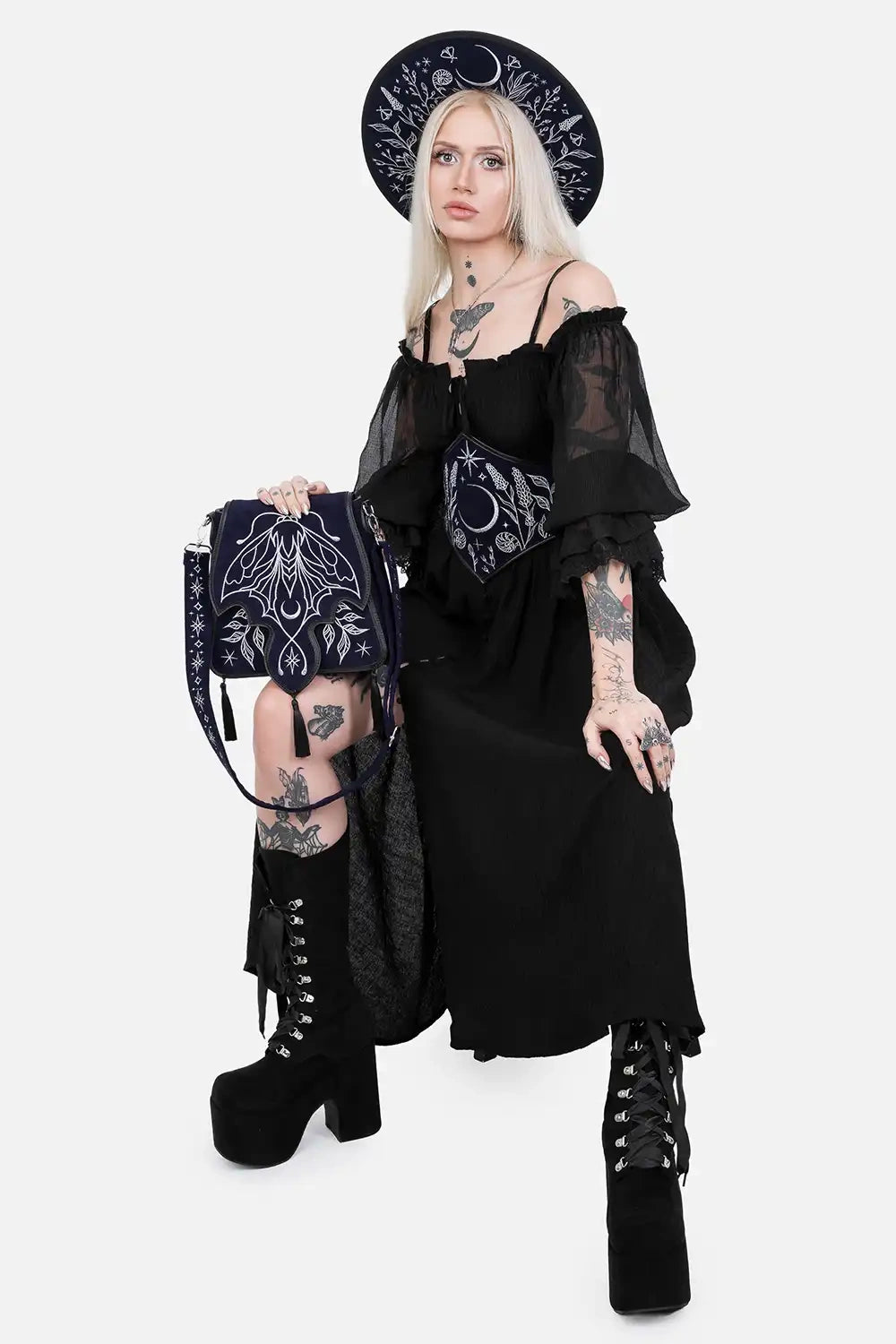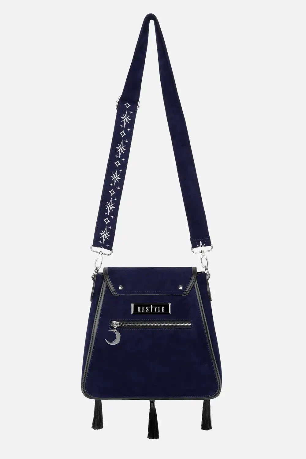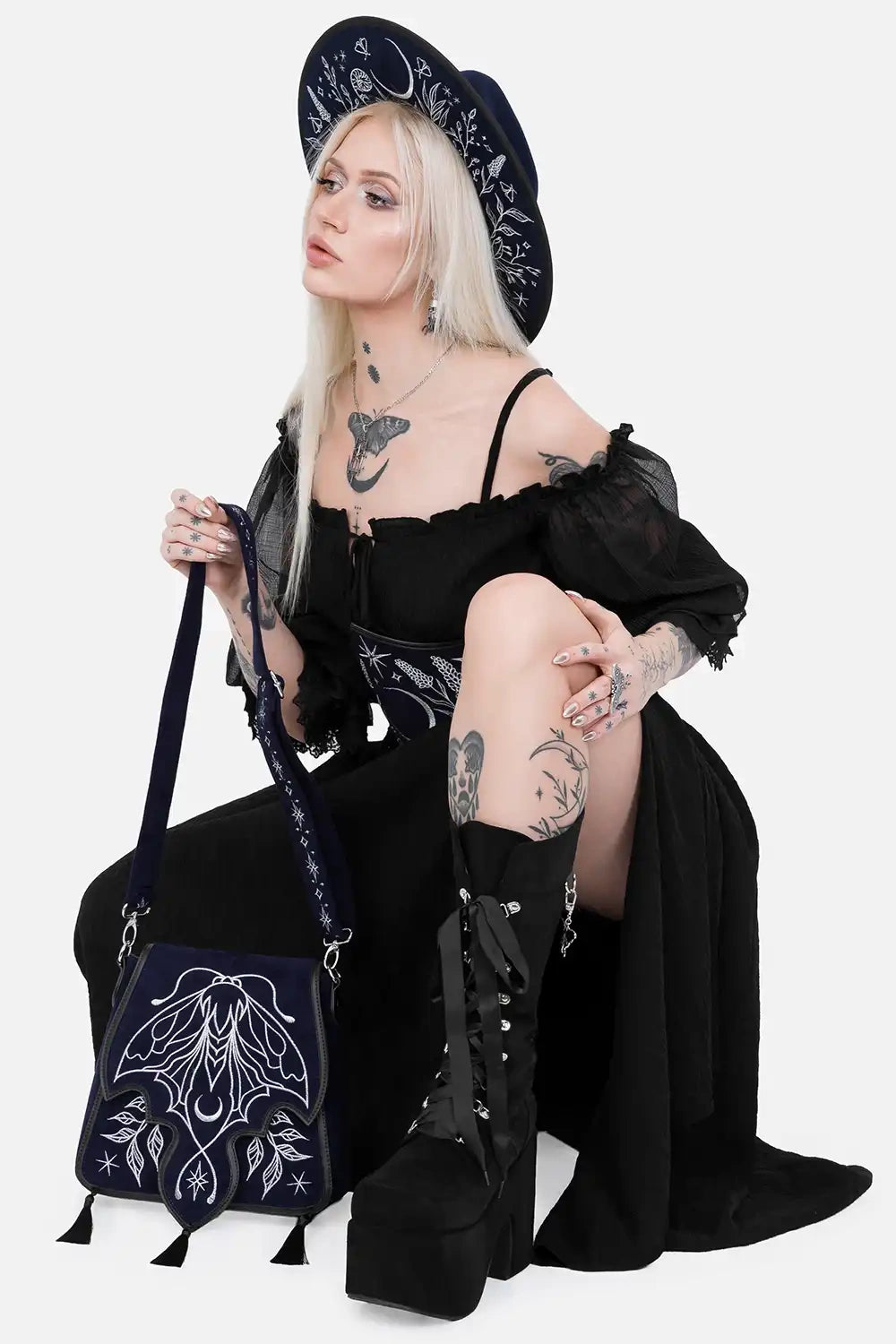 A dark blue faux suede bag inspired by the rich, mysterious depths of the night sky. The large luna moth embroidery, outlined in shimmering silver thread, glimmers like starlight, surrounded by stars, a crescent moon, and delicate botanical motifs along the bottom. This tassel shoulder bag with front flap brings a magical, whimsical touch to any outfit, perfect for celestial or dark fairycore looks.