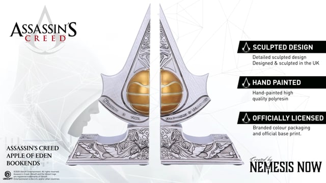 Show your commitment to the Assassin's pursuit for freedom with Nemesis Now's Apple of Eden Bookends. The golden apple is held securely within the silver emblem of the Assassins. Engraved on the emblem is the maxim of the Assassin Order; 'Nothing is true, everything is permitted'.