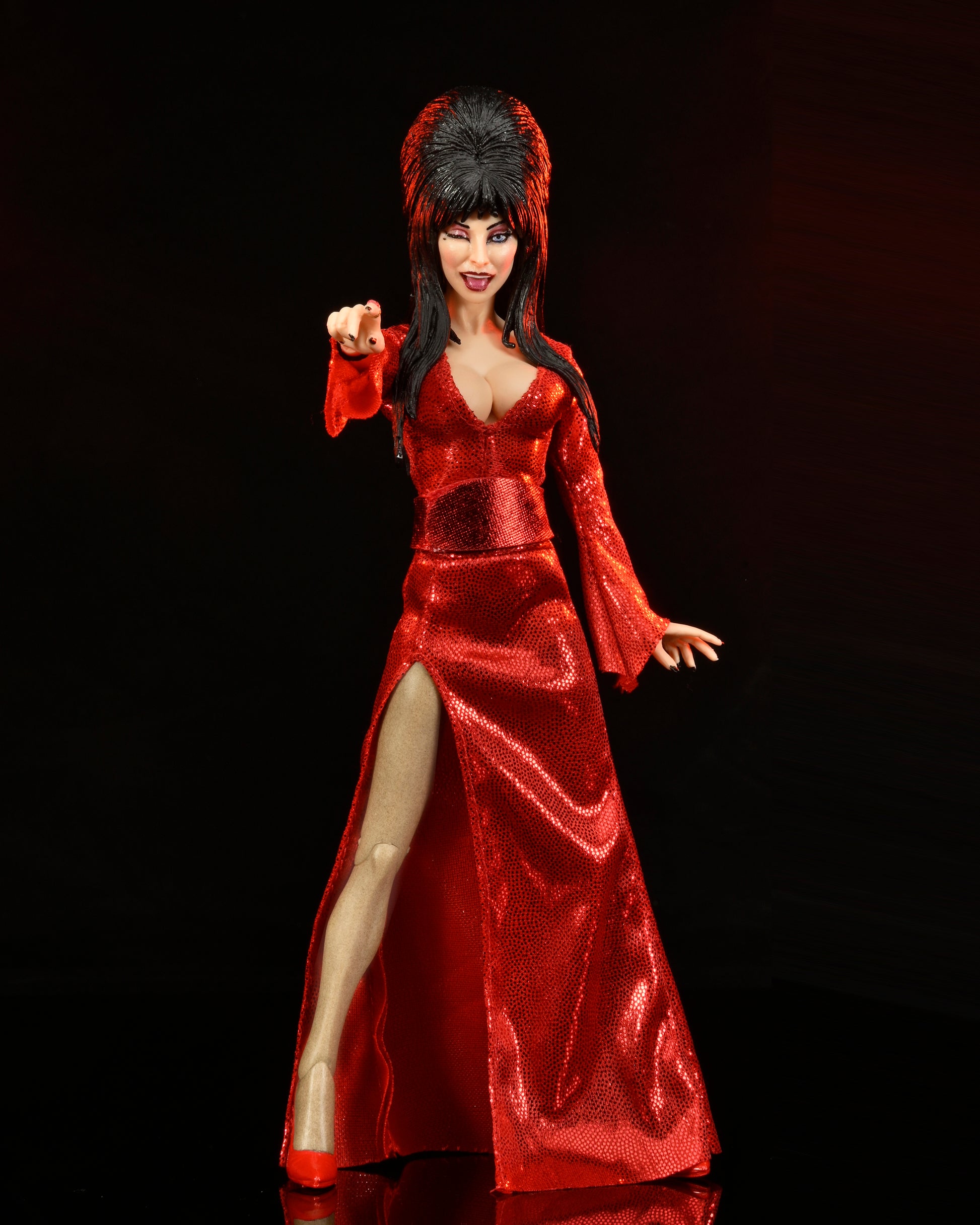The devilishly delightful Cassandra Peterson has played the part of Elvira for more than 40 years with grace, humor and more than a little camp. NECA is proud to present this positively patriotic figure of the Mistress of the Dark in a sparkling red dress for your horror collection. The 8” Elvira action figure is fully articulated and features tailored fabric clothing, plus plenty of accessories... alternate winking head, skull and snake candle holder, chalice, and figure stand