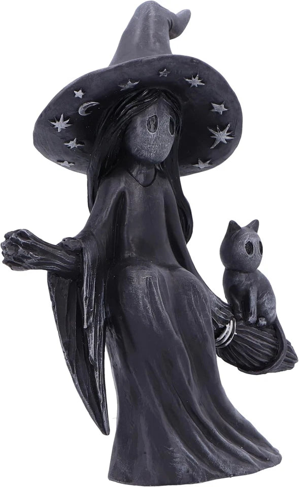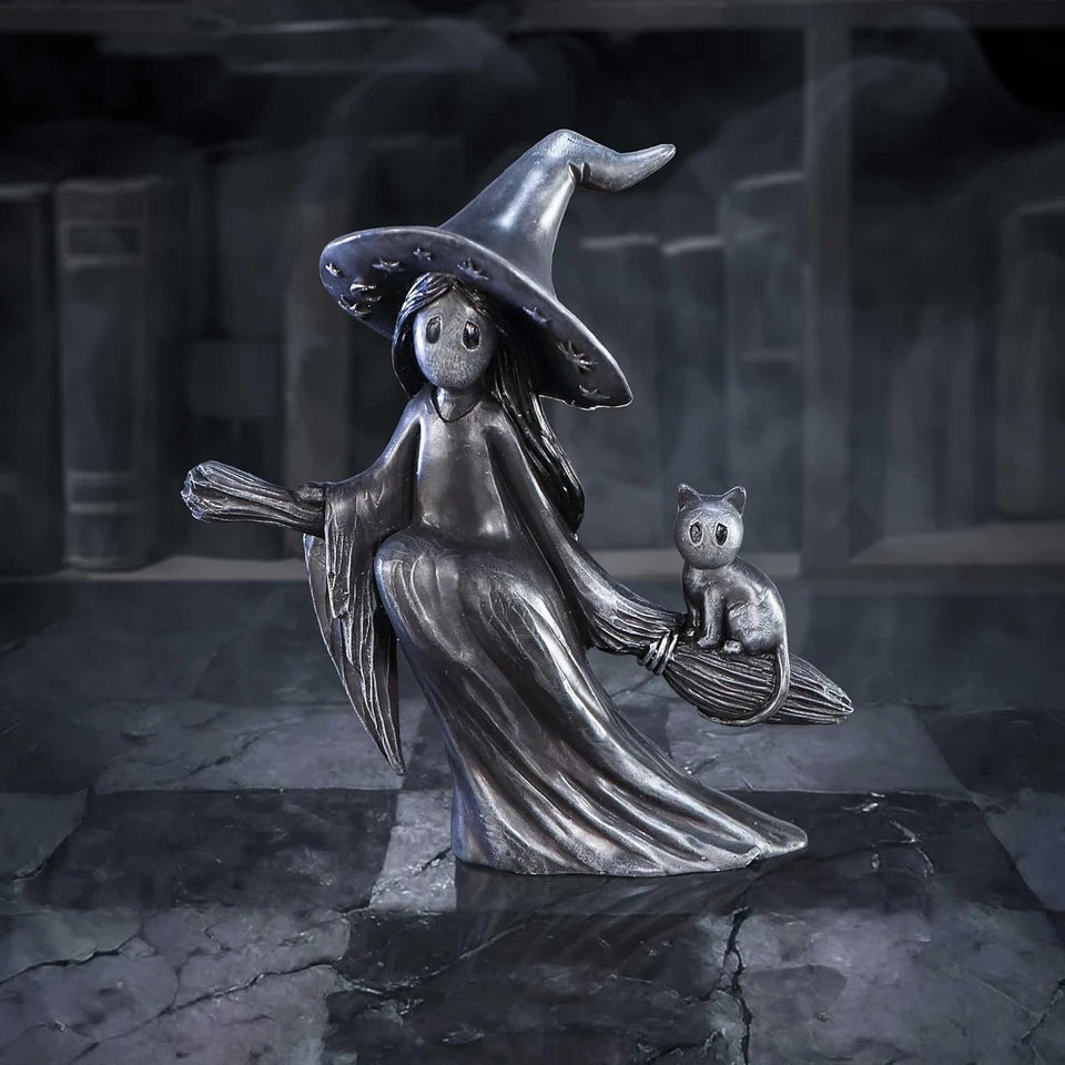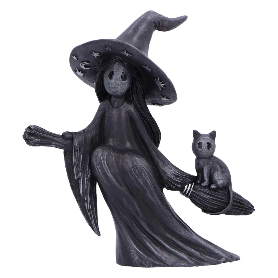 Description: Meet Beam, the captivating figurine from Nemesis Now's original Little Souls range. Beam features a striking black witch soul gracefully riding a broomstick, with a charming cat companion perched on the back.