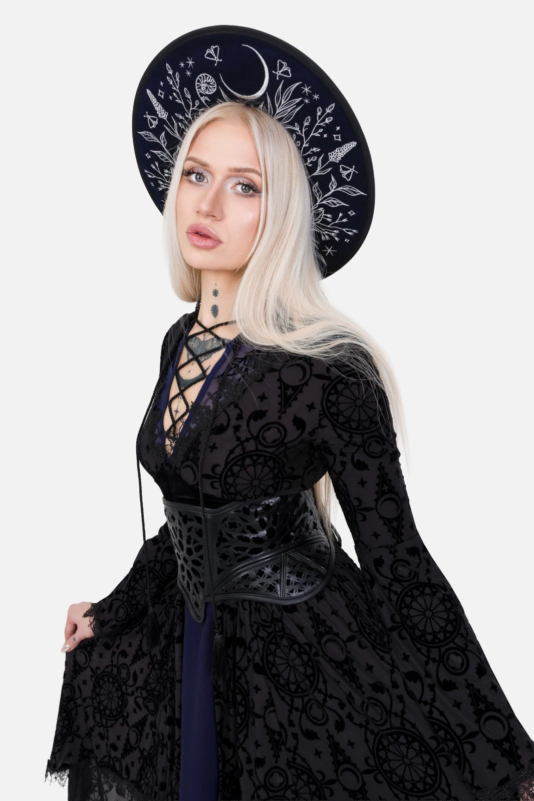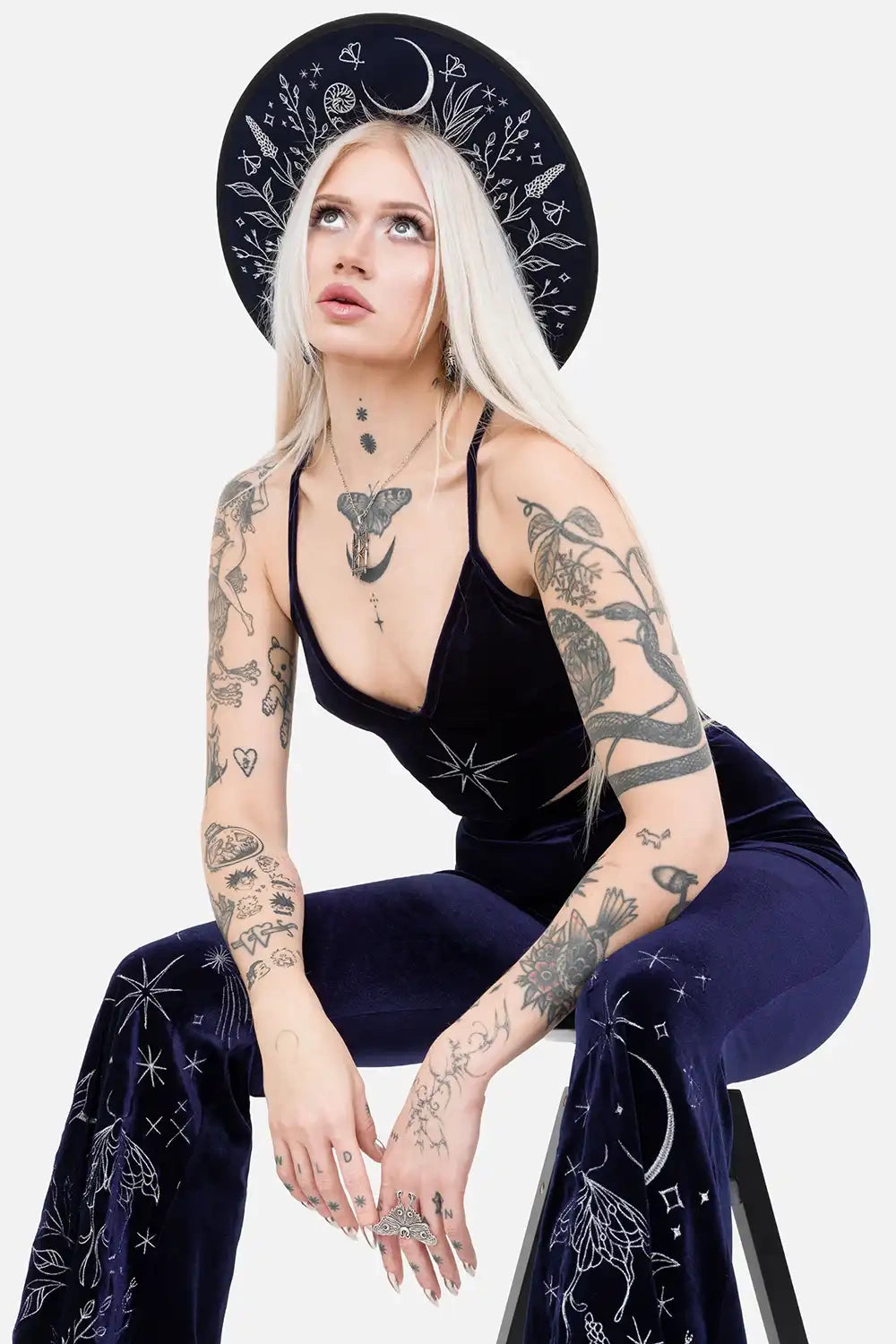 A deep navy wide-brim fedora adorned with shimmering silver embroidery - the perfect fantasy hat for lovers of magic, mysticism, and alternative style. This enchanting blue hat with silver moths, crescent moons, and night-flora details blends ethereal elegance with a bold, whimsigoth aesthetic.