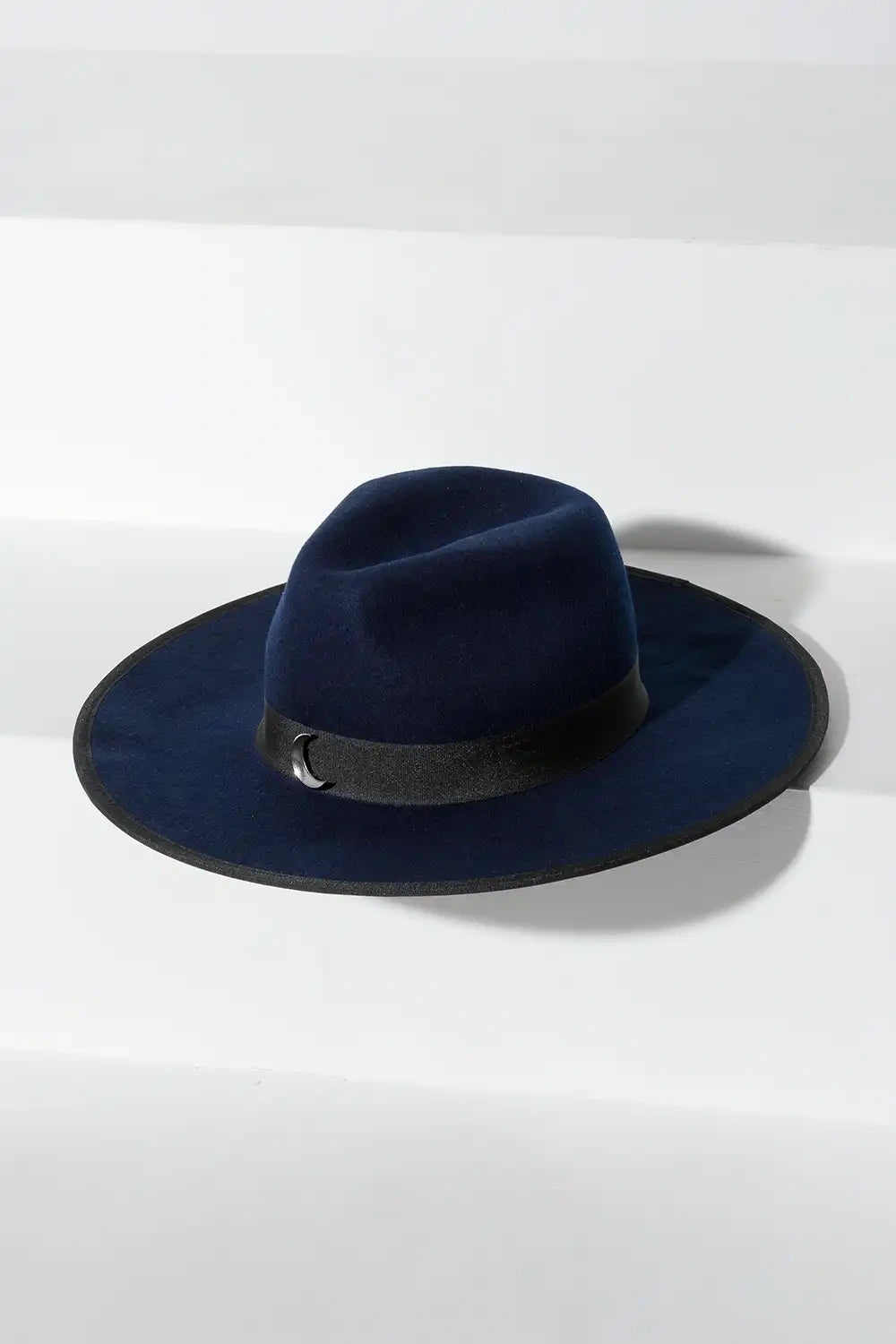🌙 STELLAR GLOW WIDE BRIM HAT – Midnight Blue Wool Hat with Silver Moth & Celestial Embroidery