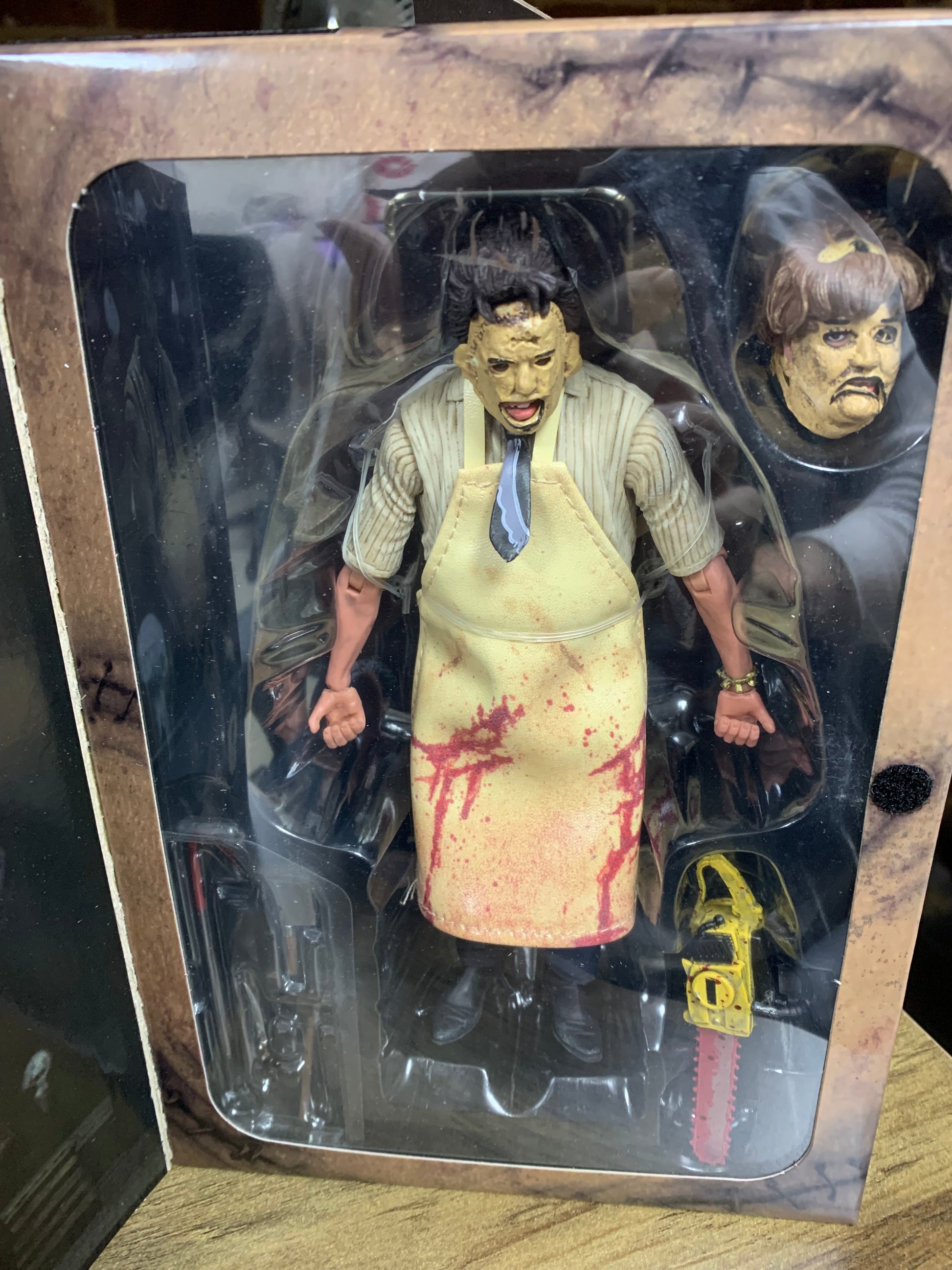 Leatherface comes with chainsaw, knife, mallet, meat hook, cleaver, and a vinyl apron.