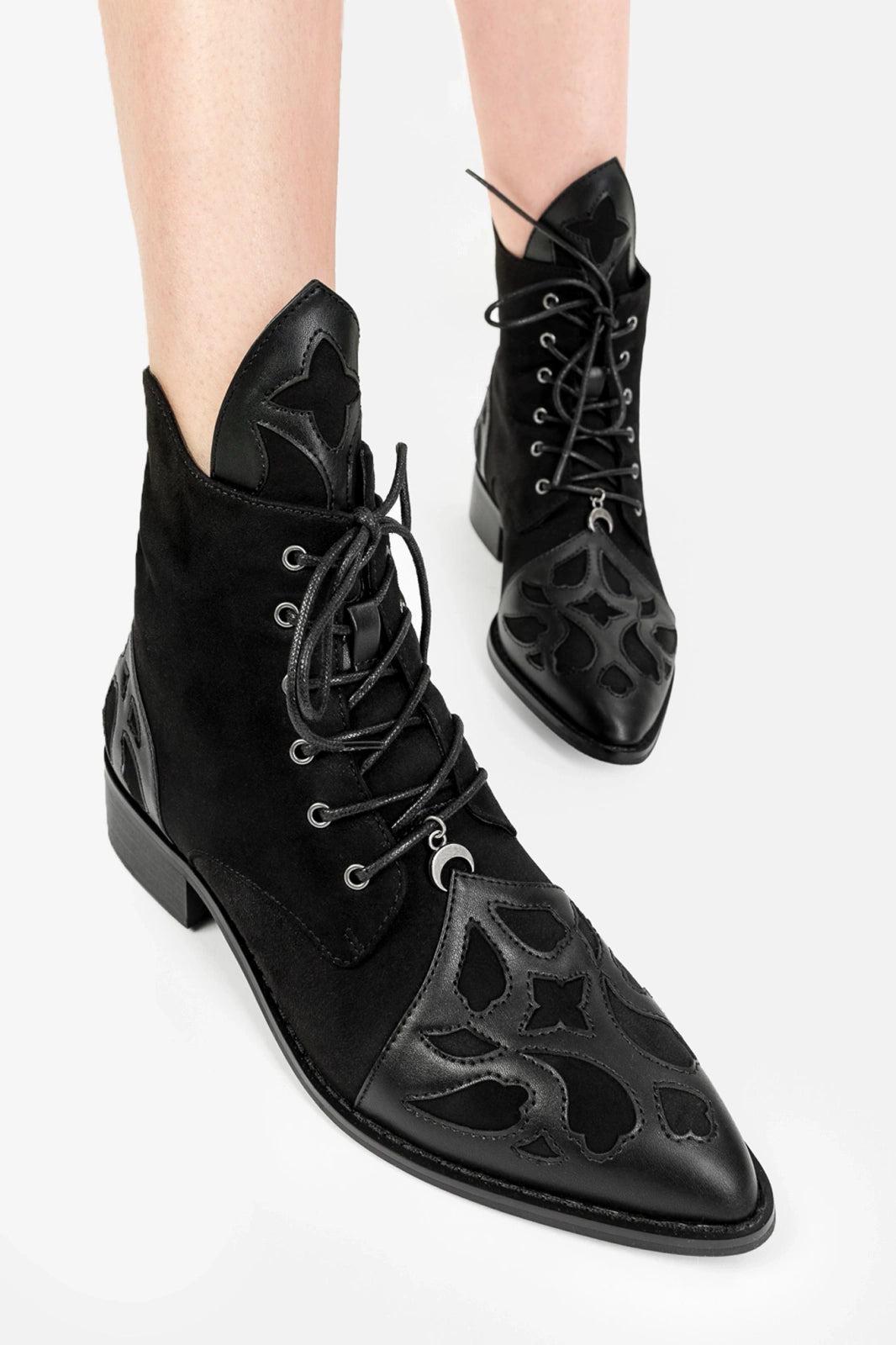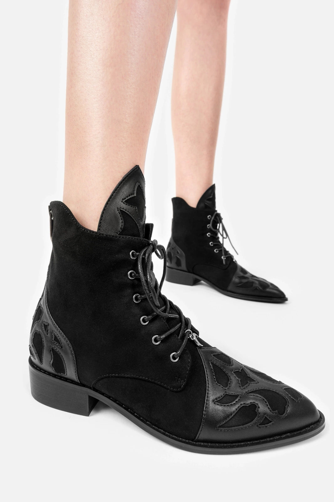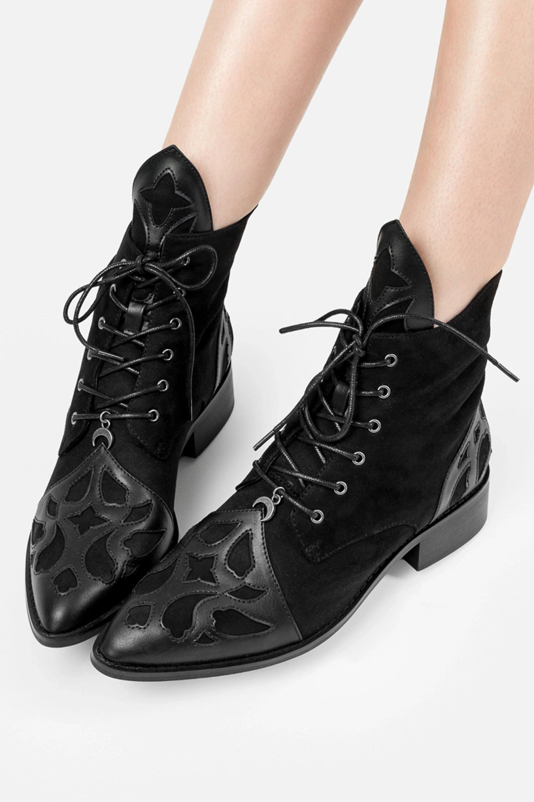 Inspired by cathedral architecture, these faux suede gothic pikes feature pointed shapes and intricate PU leather cut-outs. The low heel and sharp silhouette stay true to the original pike design — elegant, edgy, and timeless.