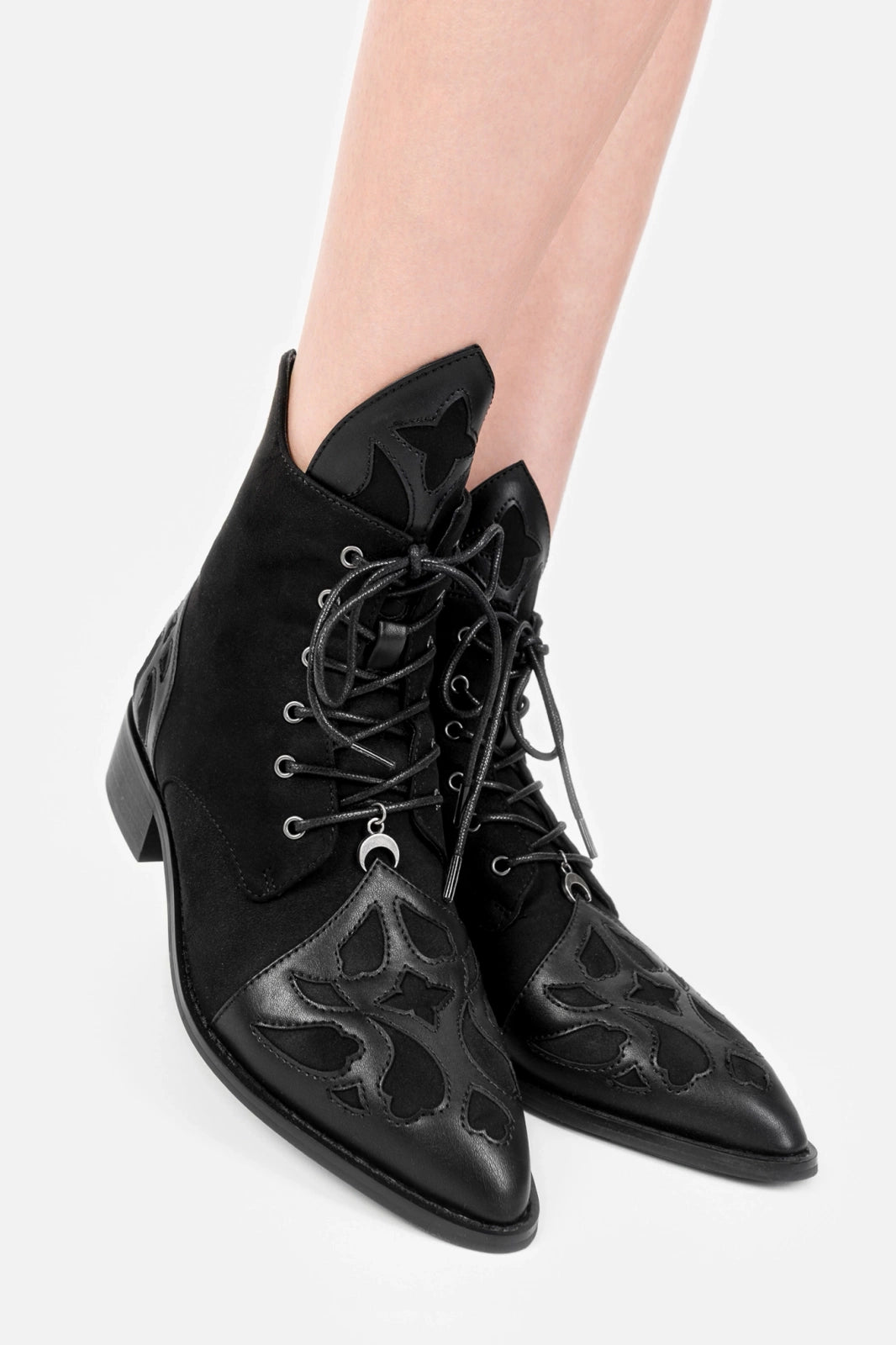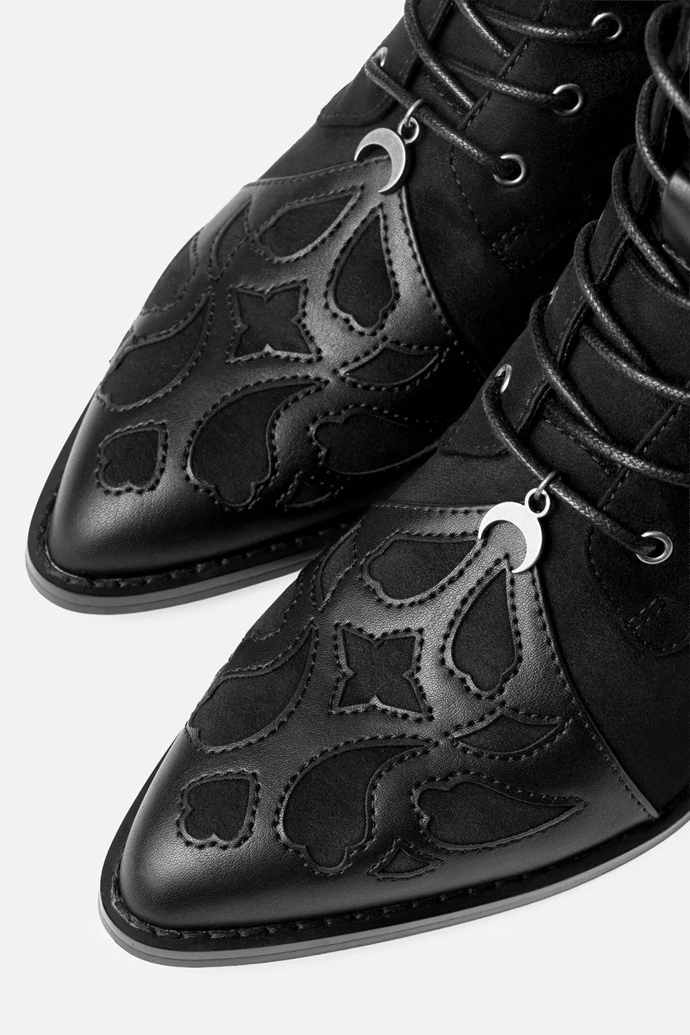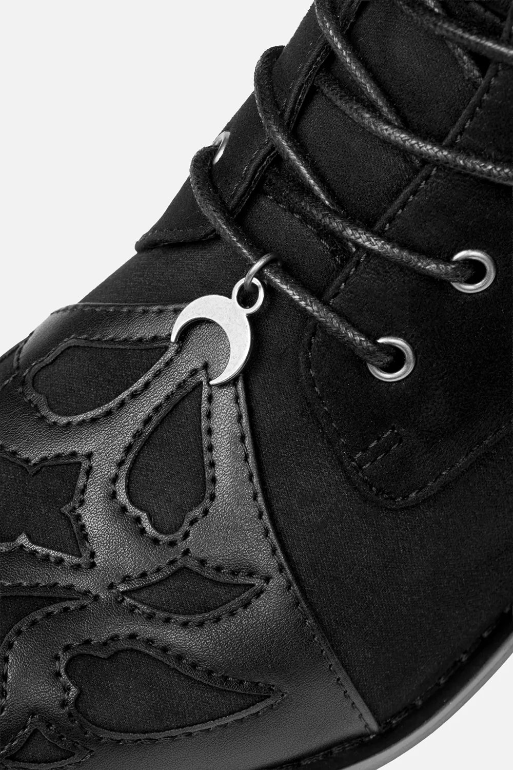 Finished with antique silver details and a small crescent moon charm, these shoes are made for those who walk the line between dark tradition and bold expression.