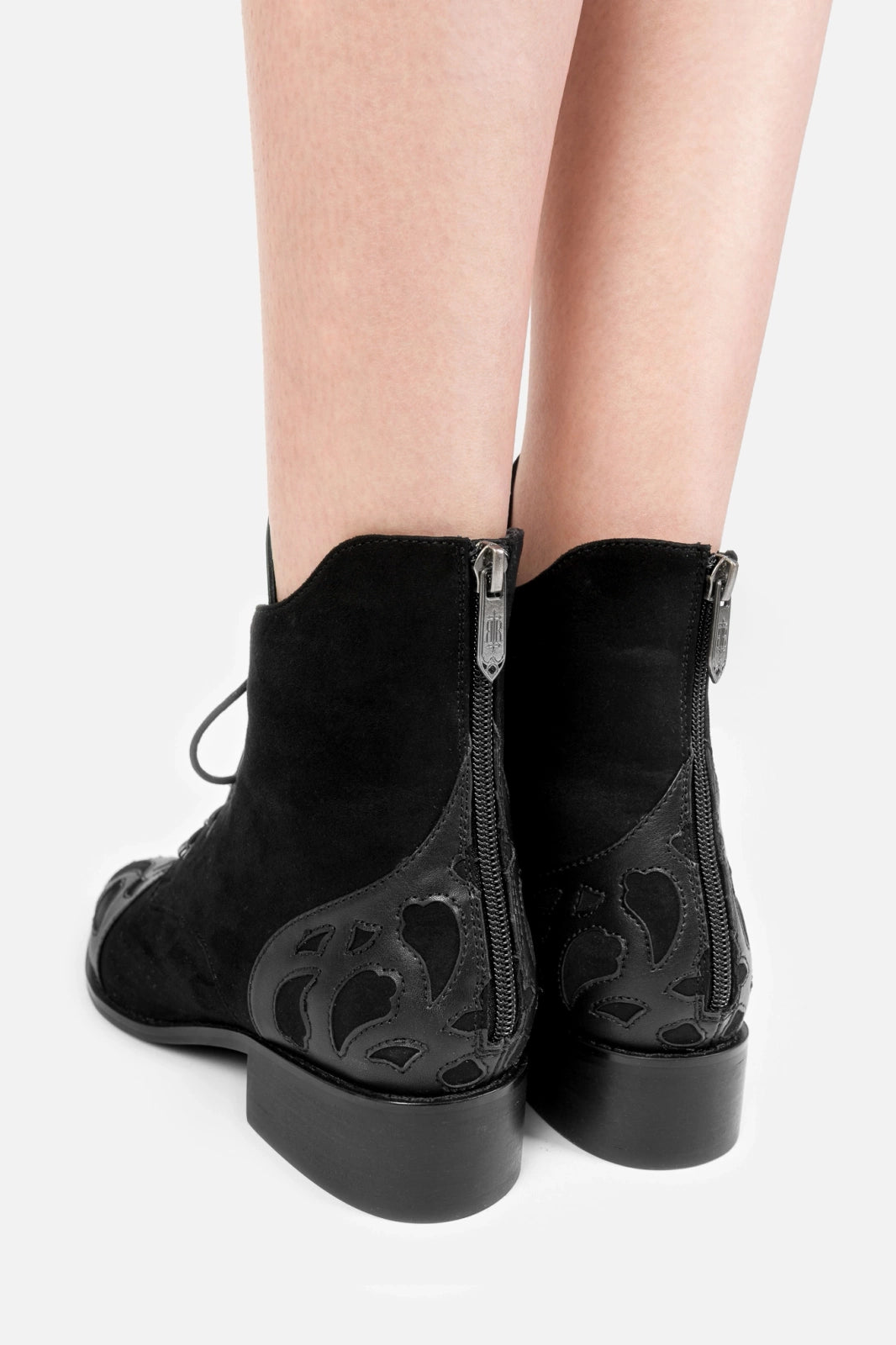 ✦ features intricate cathedral tracery cut-outs on tongue, heel, and toe — crafted in PU leather, topstitched on faux suede