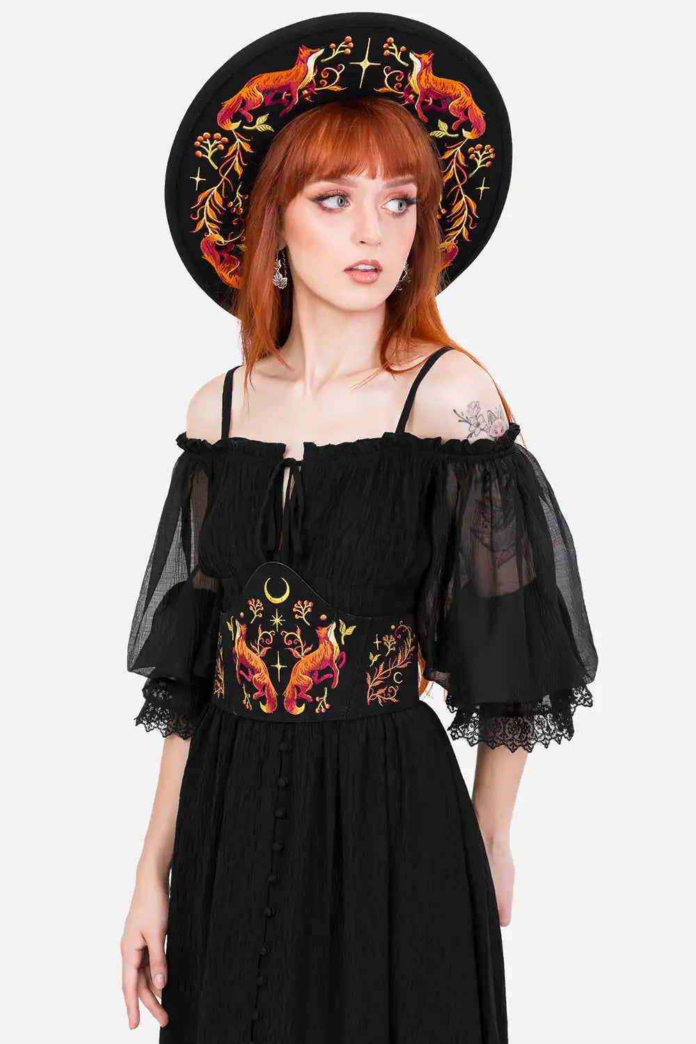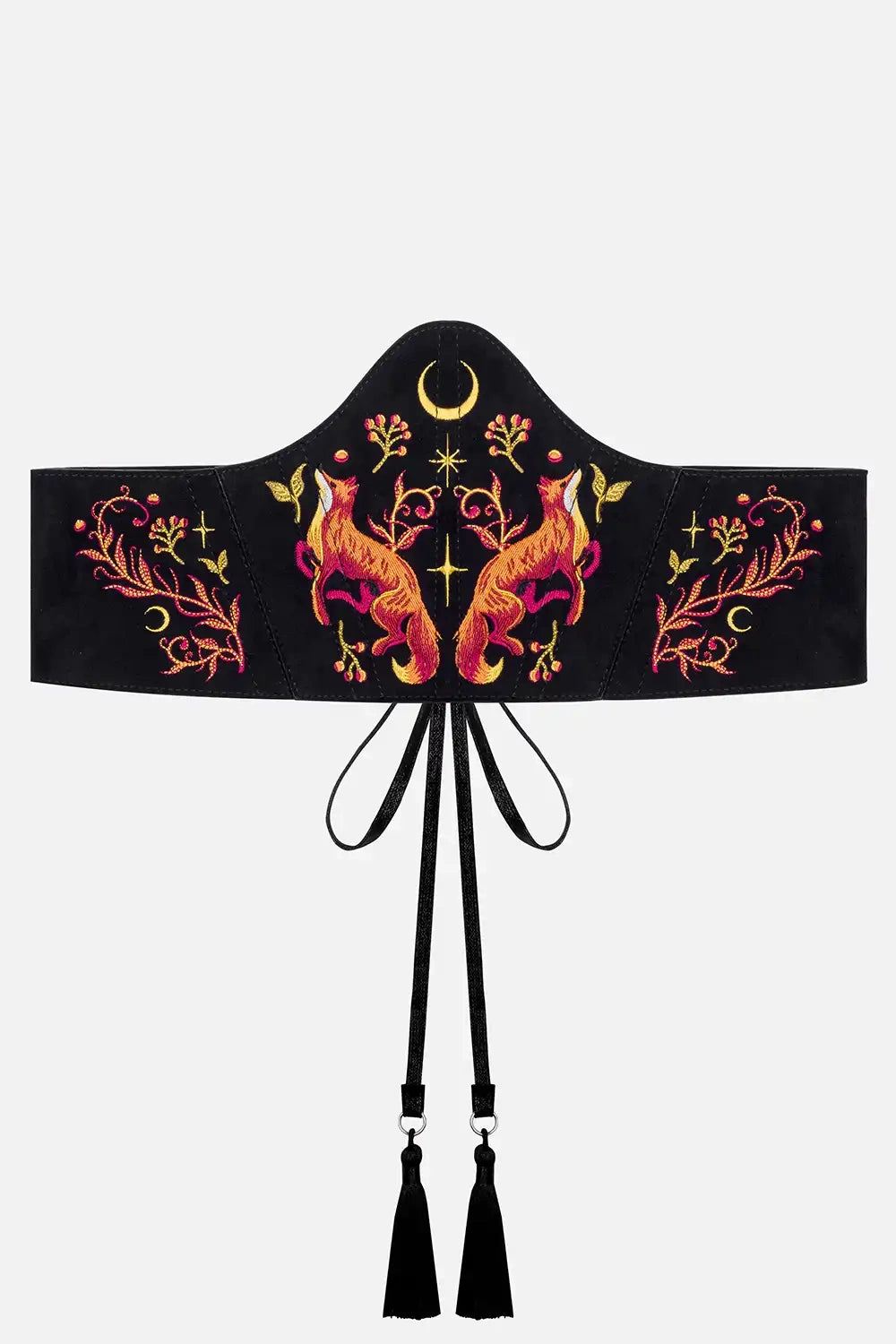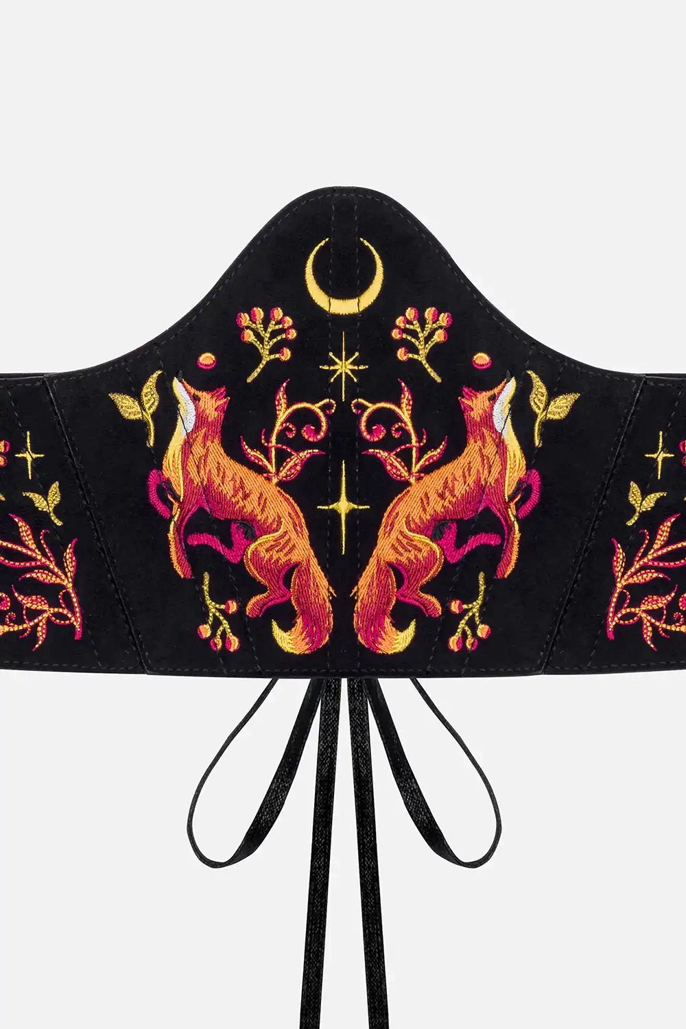 A dark, elemental under-bust corset belt adorned with fiery fox spirit embroidery. This black suede belt with foxes and nature-inspired motifs evokes the wild magic of forest flames. Perfect for witches and nature-inspired outfits, this bold corset belt channels fierce energy and mystical allure. Fox embroidery, stars, moons, and dancing flora bring a spirited, untamed charm to every ensemble.