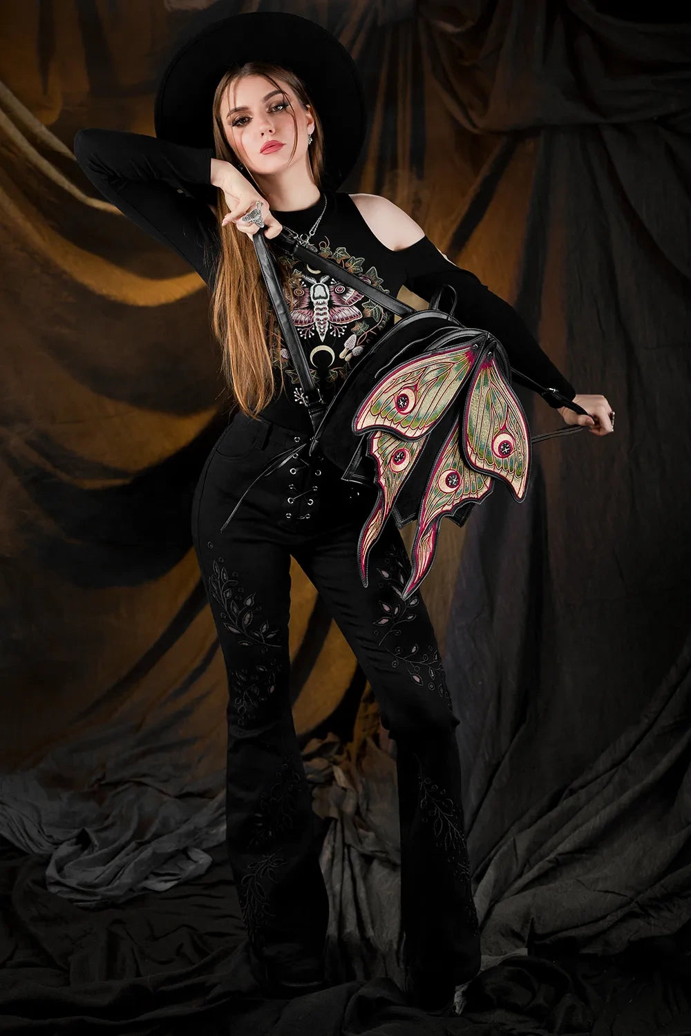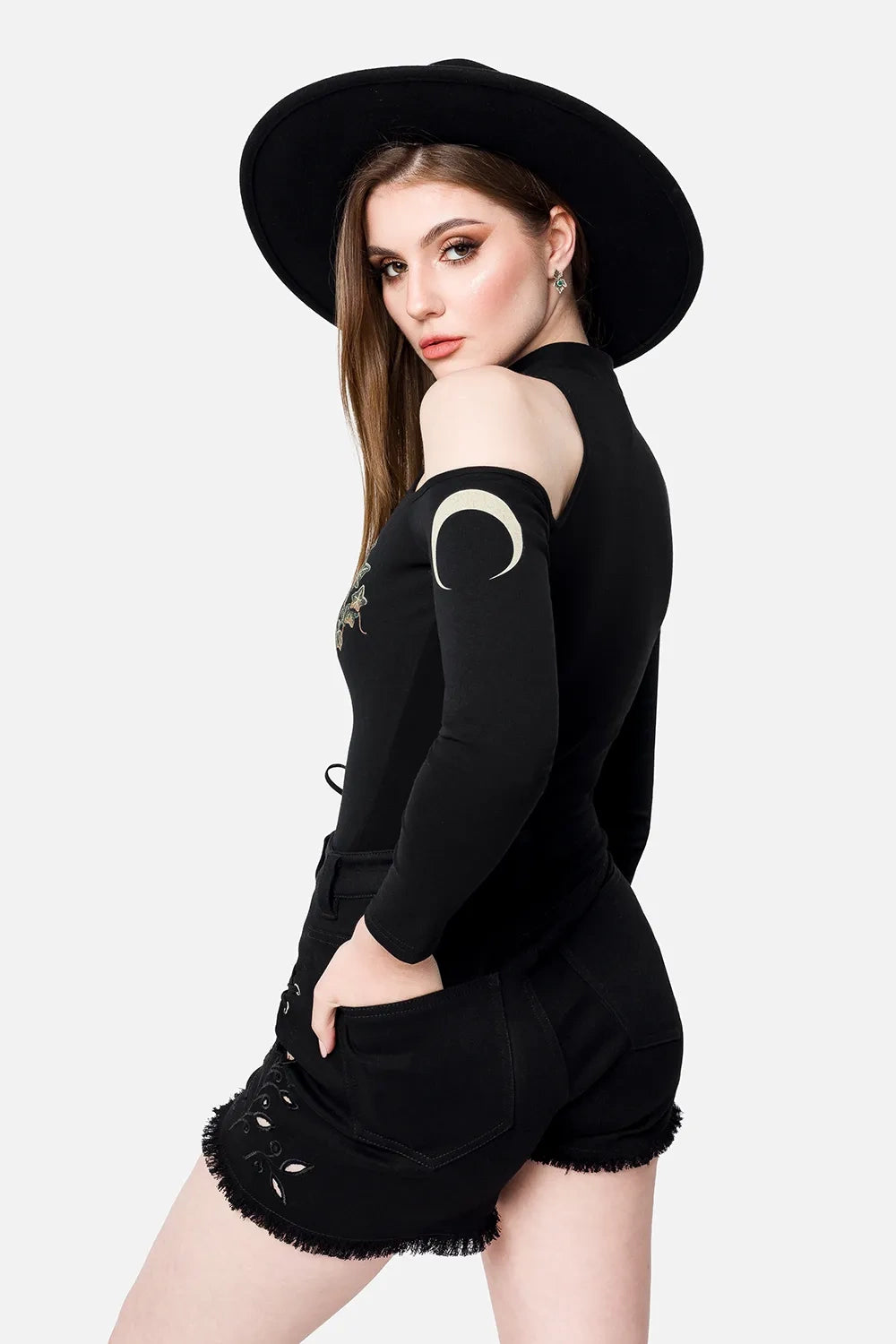 The bold front print features a majestic moth surrounded by moons, mushrooms, and trailing ivy, symbolizing transformation and forest magic. Inverted moon motifs on the shoulders add a celestial touch, while the cold-shoulder design creates a flattering, contemporary silhouette. This black cold-shoulder bodysuit is a versatile piece for whimsy, dark boho, and witchy outfits, combining mystical charm with everyday wearability.
