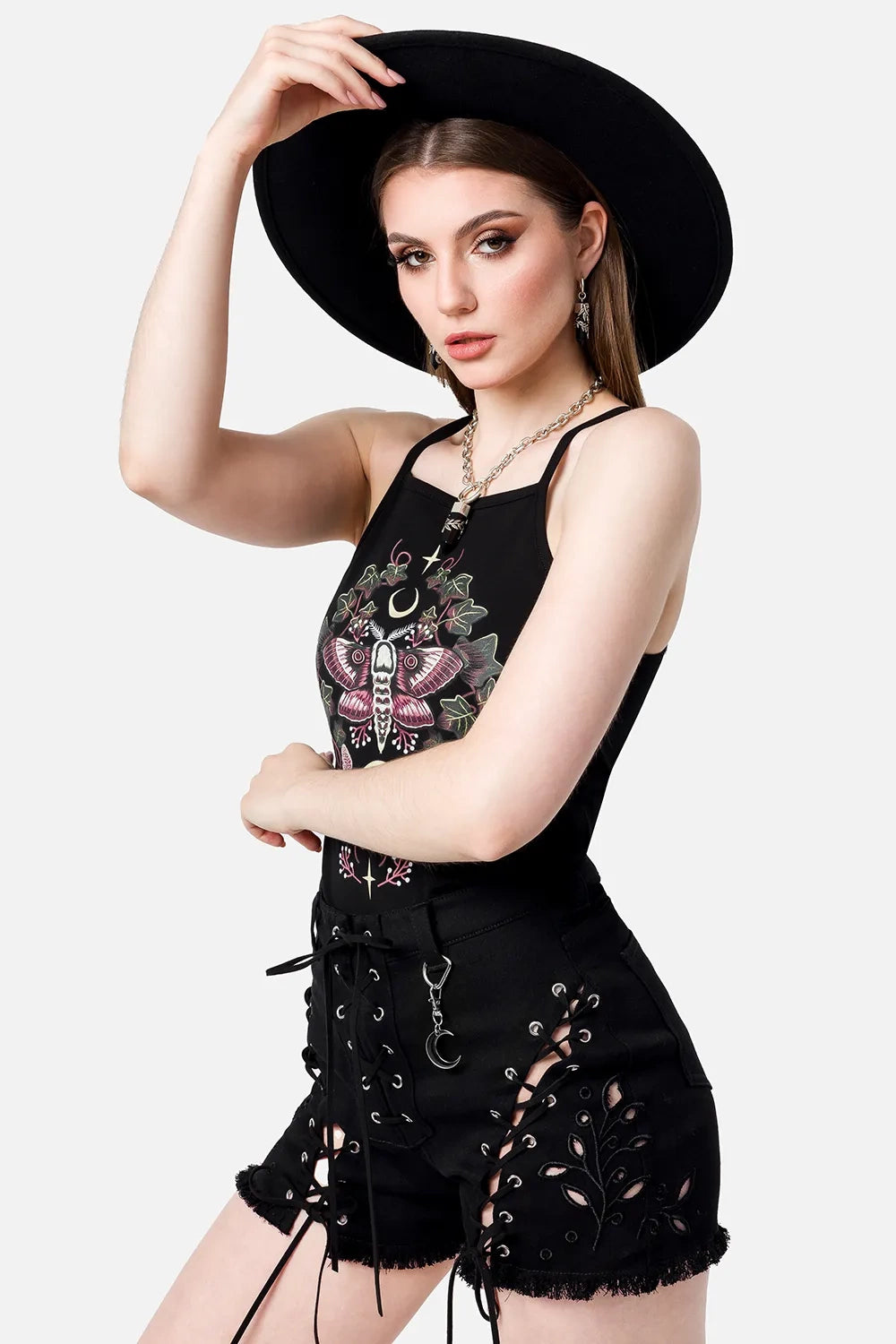 The witchy tank top is your everyday piece with a touch of moonlit magic. It’s a dreamy essential for lovers of dark boho style, whimsigoth outfits, or anyone building a witchy wardrobe.