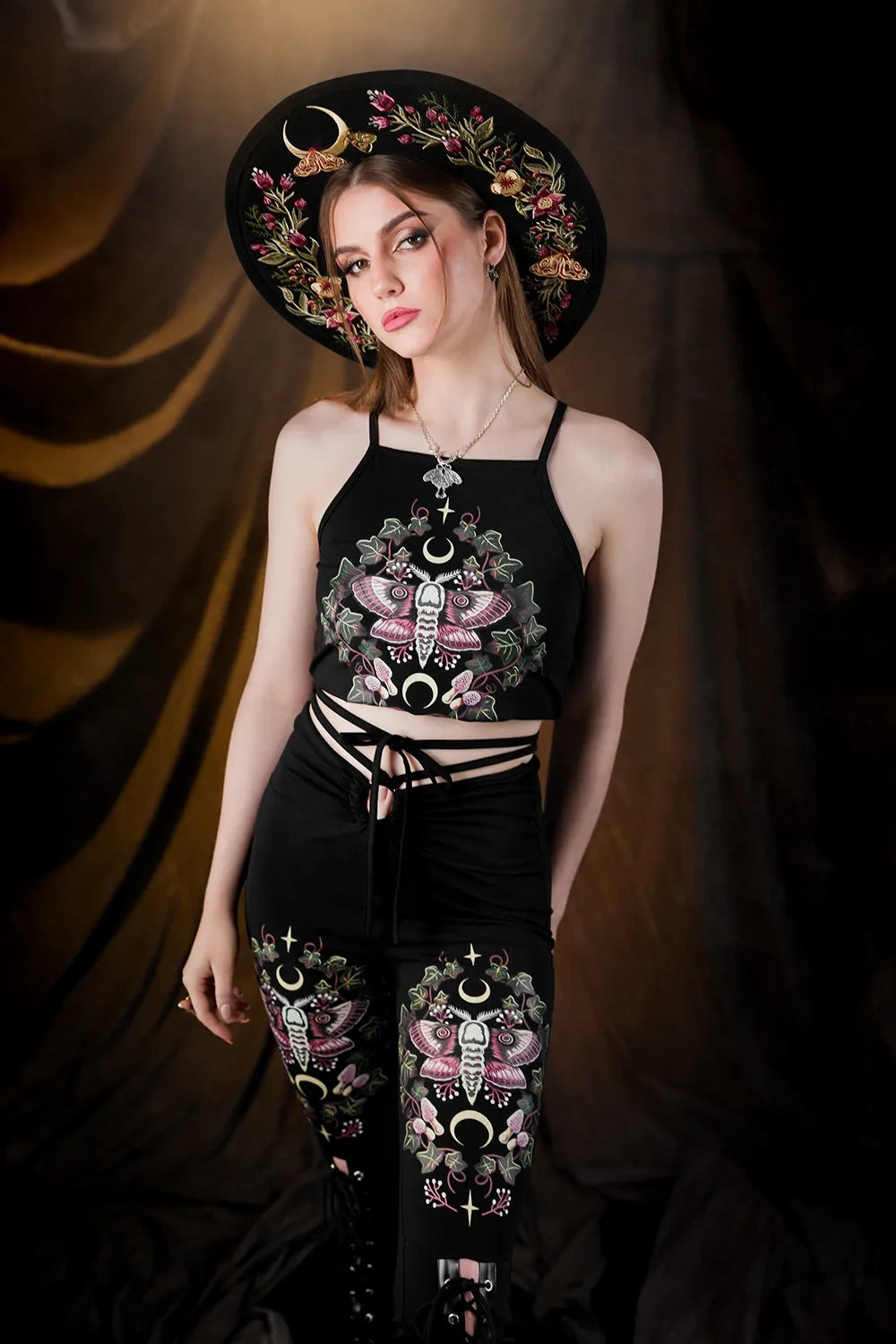 This black top with moth print is a whimsigoth camisole made from soft, stretchy cotton jersey. It hugs your body gently, with a hem that finishes just below the natural waistline. The design features a custom moth print surrounded by botanical elements, symbols of mystery, transformation, and the natural world.