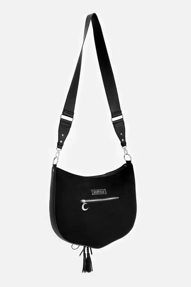 Ce sac hobo gothique n'est pas seulement un régal visuel ; elle est aussi incroyablement spacieuse, capable de receler tous les secrets de la forêt enchantée. Ouvrez-le et vous découvrirez un compartiment supplémentaire, un sanctuaire pour organiser vos affaires. Une poche zippée au dos ornée d'un croissant argenté abritera tous vos petits sortilèges secrets. Le sac à bandoulière est livré avec une bandoulière confortable et réglable ornée de cristaux, garantissant à la fois style et praticité dans vos aventures enchantées.