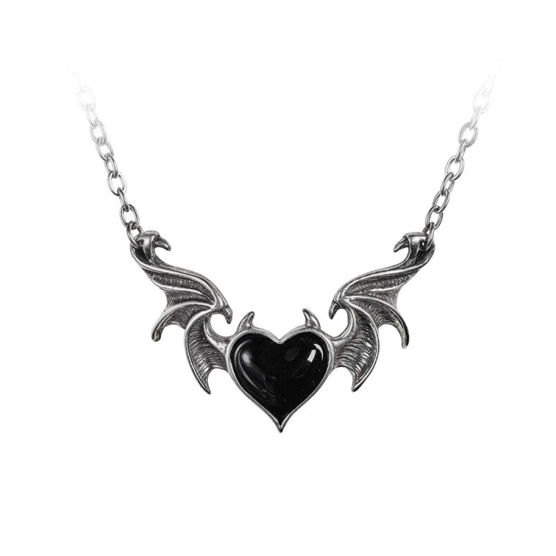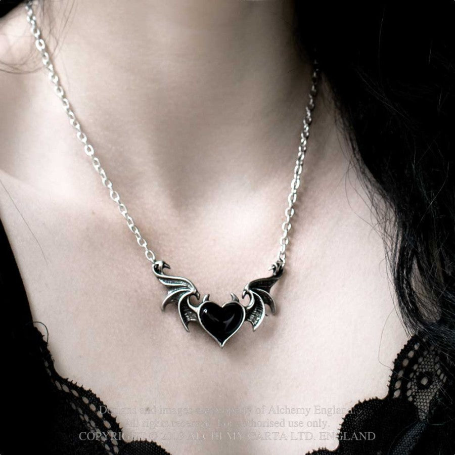 An enamelled black heart with horns, between the outstretched flying wings of a demon. A necklace upon a split trace chain 20" (50cm) overall plus a 1.5" extender chain.