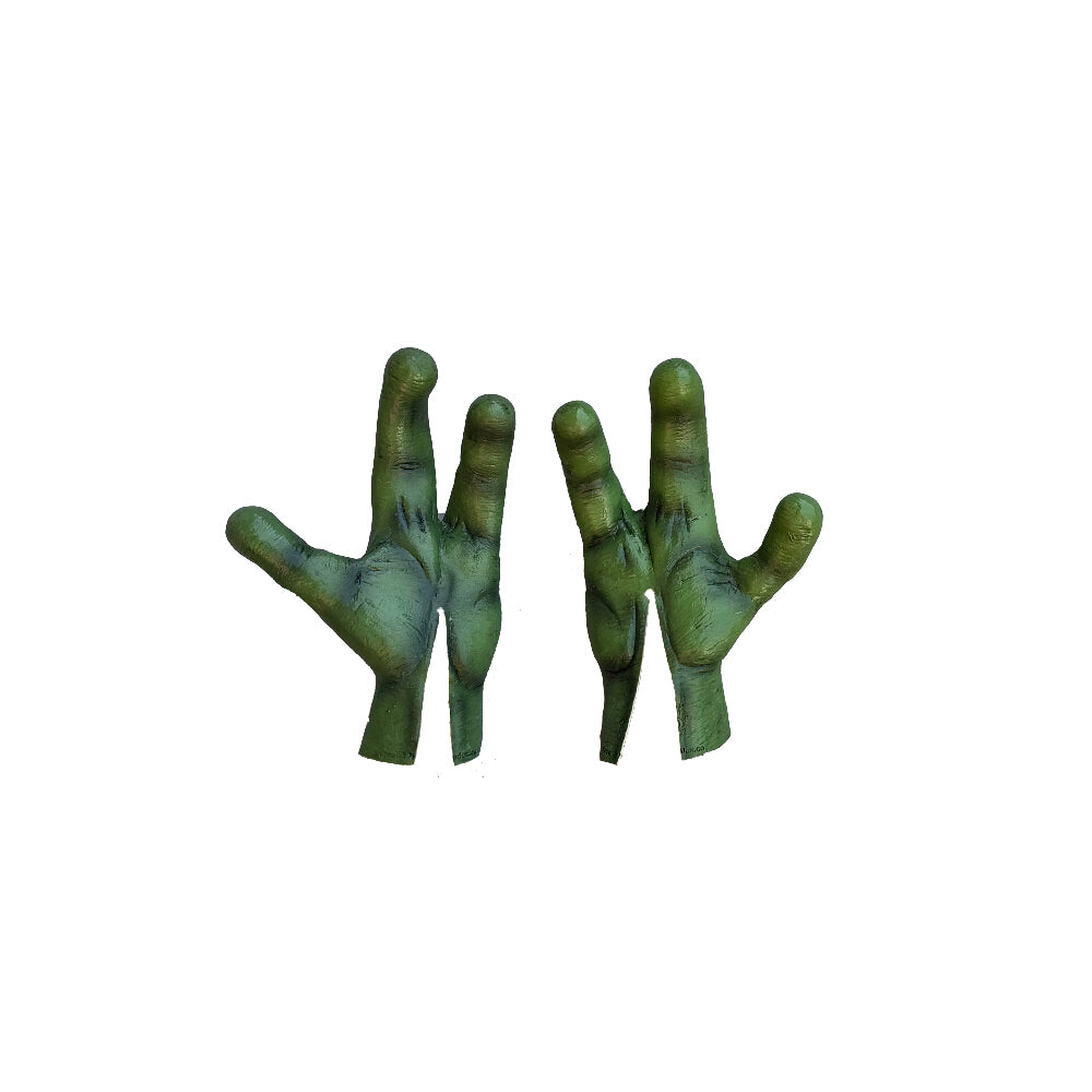 Green Alien Hands latex accessory from the Aliens line. The aliens have escaped from Area 51 to trick-or-treat and attend parties this Halloween. Complete your Alien costume with these extraterrestrial hands and surprise everyone this Halloween. Handmade and painted in Mexico with a completely artisanal process made of latex. High Quality, Durability and Original Design by Ghoulish Productions.