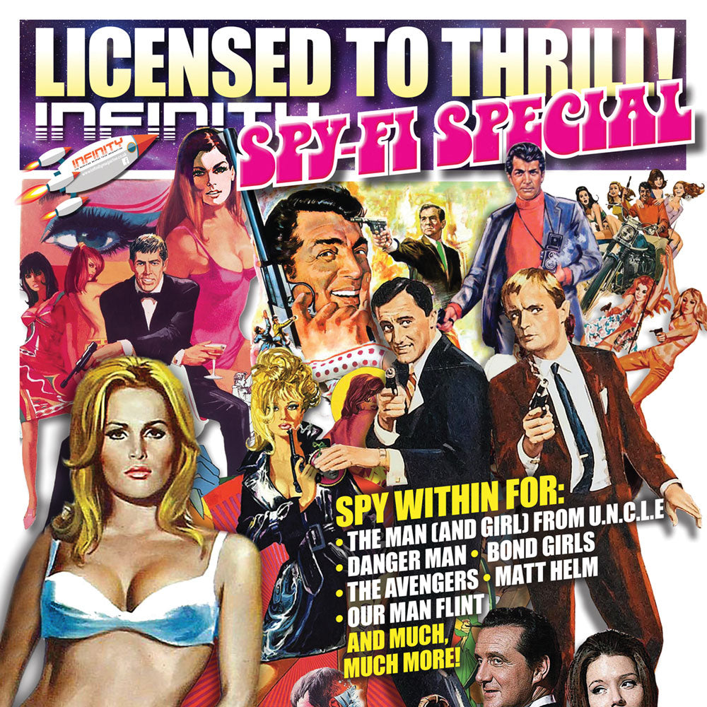 For our first ever Infinity annual we are concentrating on a very popular subject indeed, namely the spy-fi movies and TV shows of the 1960s and beyond. The 60s were of course the James Bond era when kids of the time all had their Goldfinger Corgi DB5 complete with ejector seat. On the telly there was The Man From U.N.C.L.E. as well as The Avengers and Danger Man. And then came the Bond imitators like Dean Martin’s Matt Helm and James Coburn as Our Man Flint. You’ll find all of them and more in this amazing special edition. It’s not top secret. In fact it’s in shops everywhere in the UK on November 22nd, but we’ll have copies much earlier than that so if you can’t wait then hit that pre-order link. This message will not self-destruct in 5 seconds…