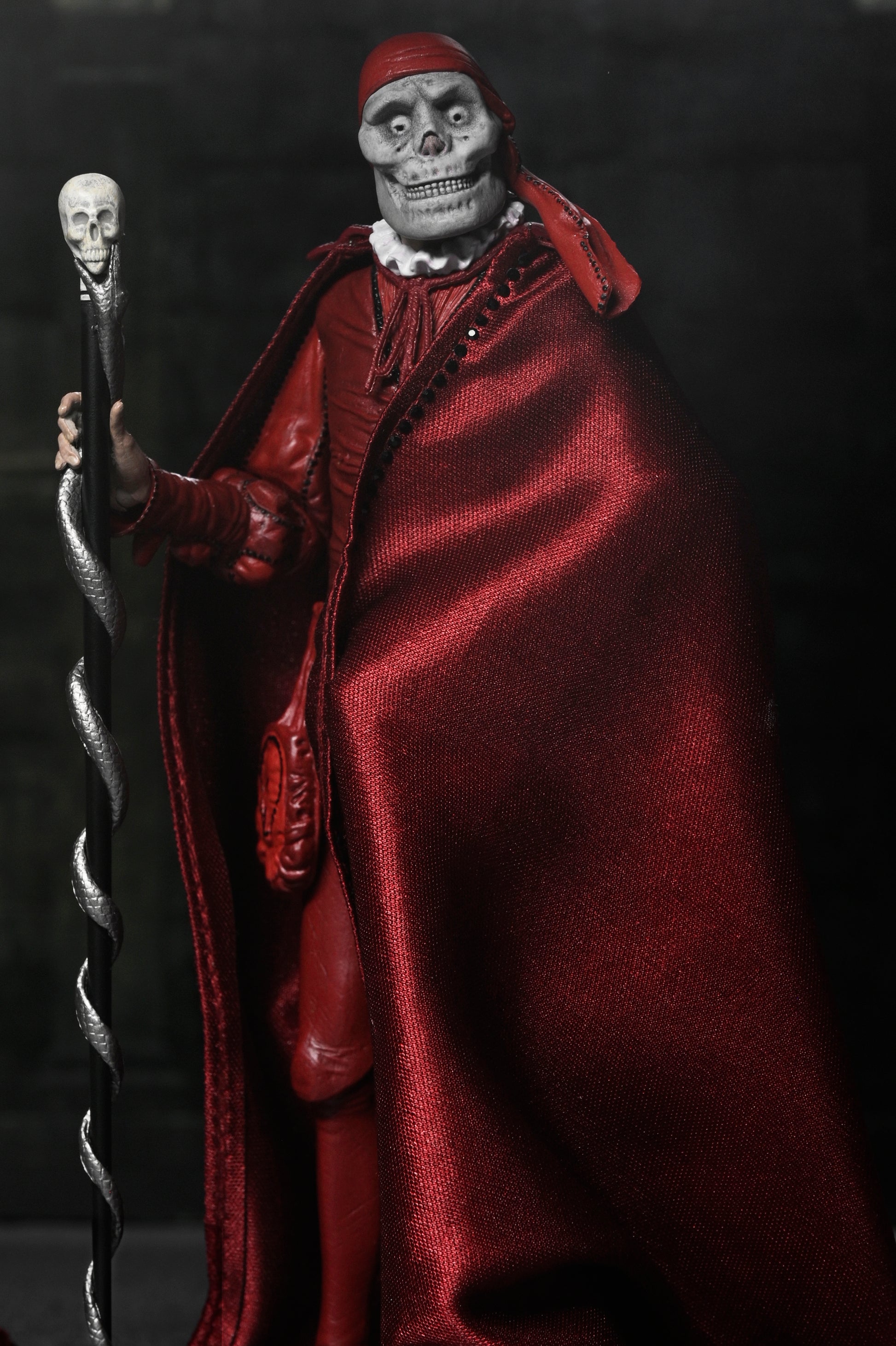 Mark the 100th anniversary of the 1925 silent film The Phantom of the Opera with this stunning action figure from NECA. Featuring the Phantom (Erik) in his iconic "Red Death" disguise from the masquerade ball, this 7-inch scale figure captures the haunting elegance of Lon Chaney’s classic portrayal. Hiding his disfigured face beneath the skull mask, he spies on Christine and Raoul on the rooftop of the Paris Opera House. This collectible includes a soft goods cloak, large brim hat, and skull staff accessories. Plus, multiple heads and hands, which are interchangeable with other NECA Phantom of the Opera figures (sold separately). Presented in a collector-friendly box with an opening front flap, this figure is a must-have for horror fans and classic film collectors alike!