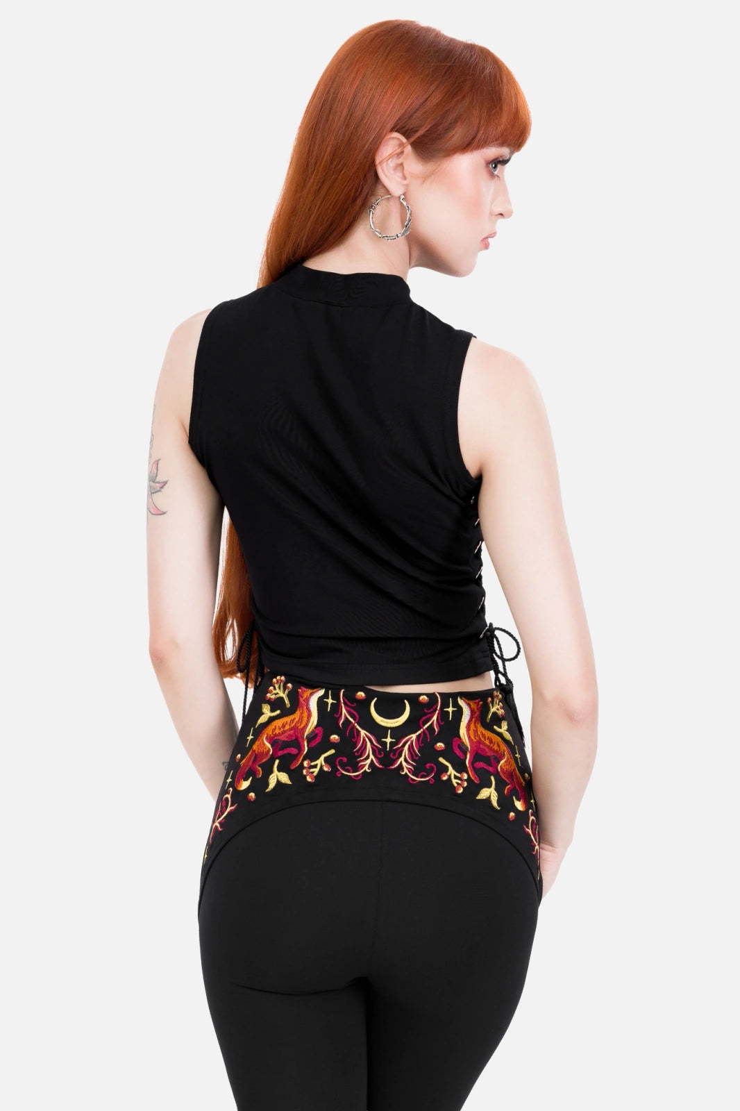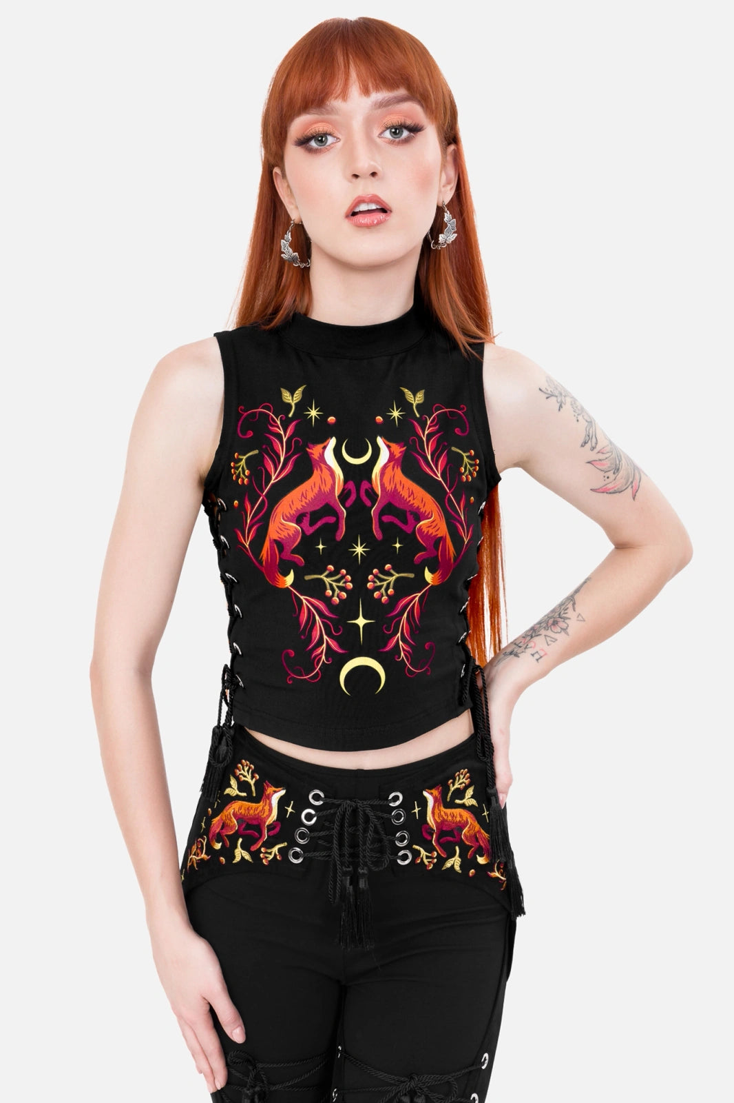 🔥✨ AMBER MOON TOP – Black Tank Top with Fox Print and Side Lacing 🦊🌙