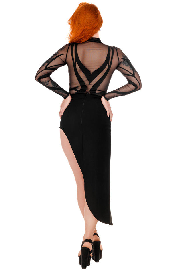 The seams have been meticulously adorned with artificial leather stitching, bestowing the skirt with an enchanting gothic allure and ensuring that it captures attention with its unparalleled uniqueness. The mesh patterns introduce an alluring sensuality and an aura of intrigue to the skirt's aesthetics. The strategic placement of these mesh inserts and seams artfully accentuates feminine contours and contributes to a visually slender silhouette.