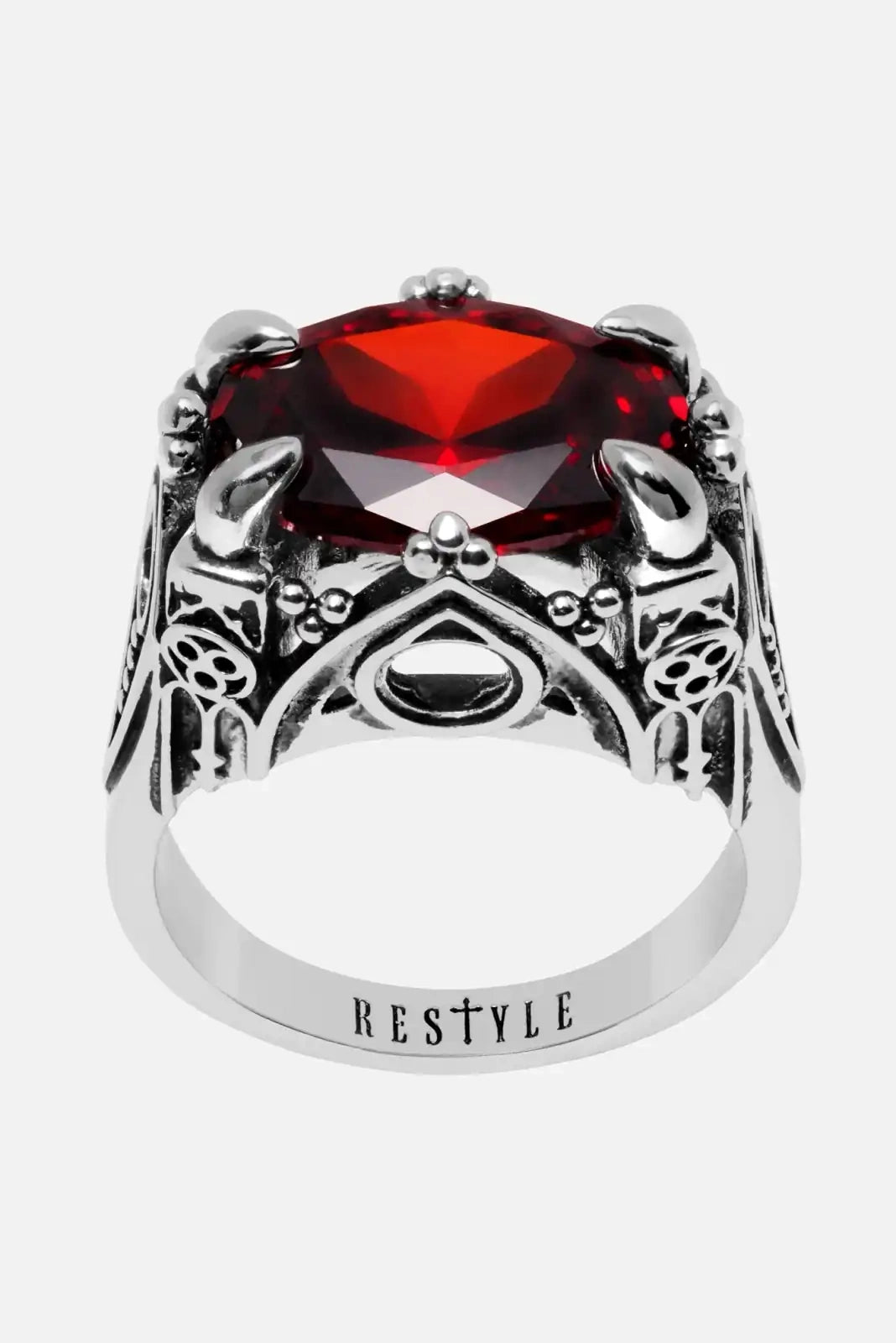 Legend says that this ring was once made for a countess who roamed dark, empty halls long after midnight. Her finger sparkled with a ruby-red stone, said to hold a drop of her own blood. The ring’s cathedral tracery, carved by candlelight, was crafted by a master artist who wove symbols of mystery and power.