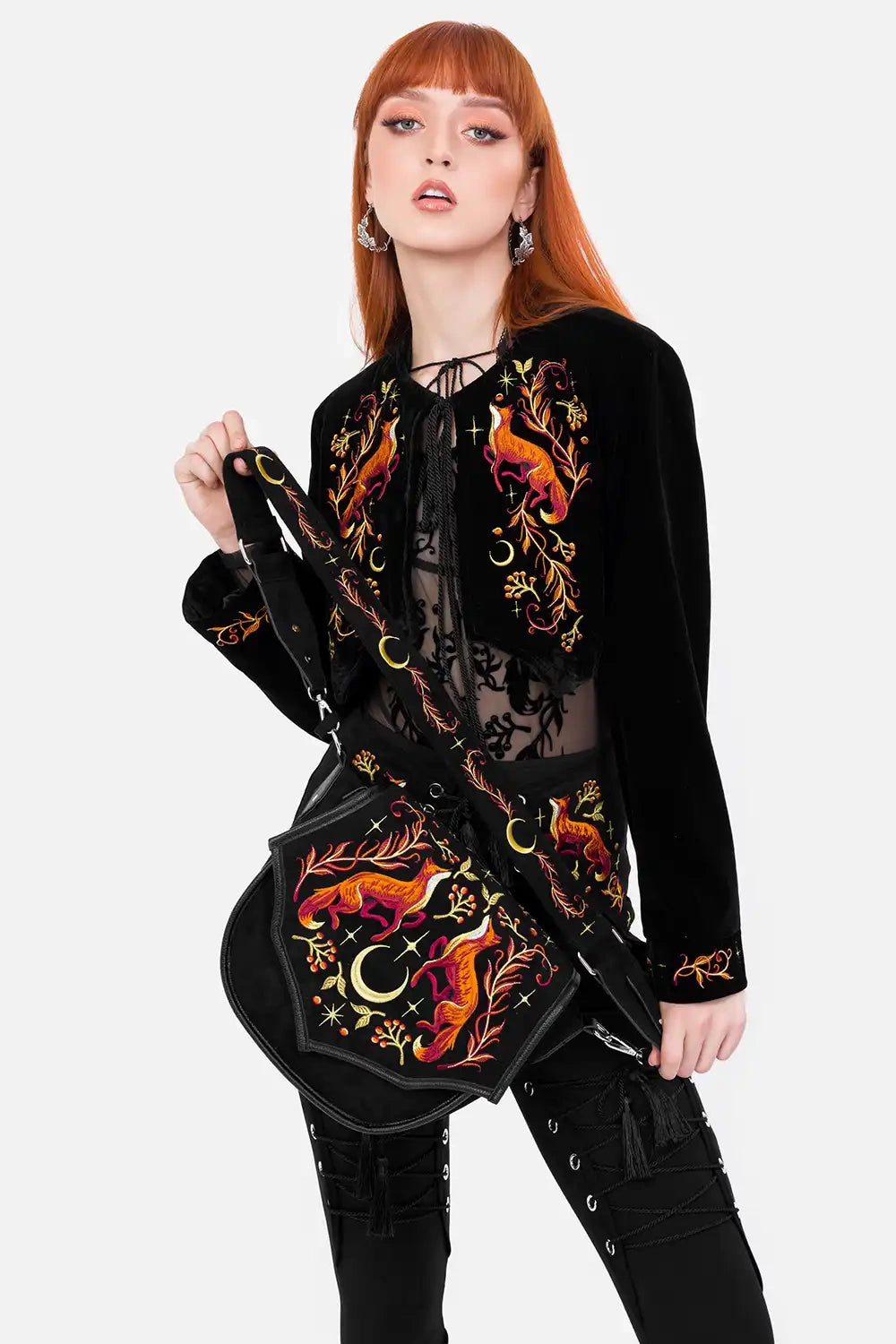 🦊🔥 FOXFIRE NIGHTS BAG – Black Faux Suede Shoulder Bag with Fox Embroidery & Dark Forest Details 🌙