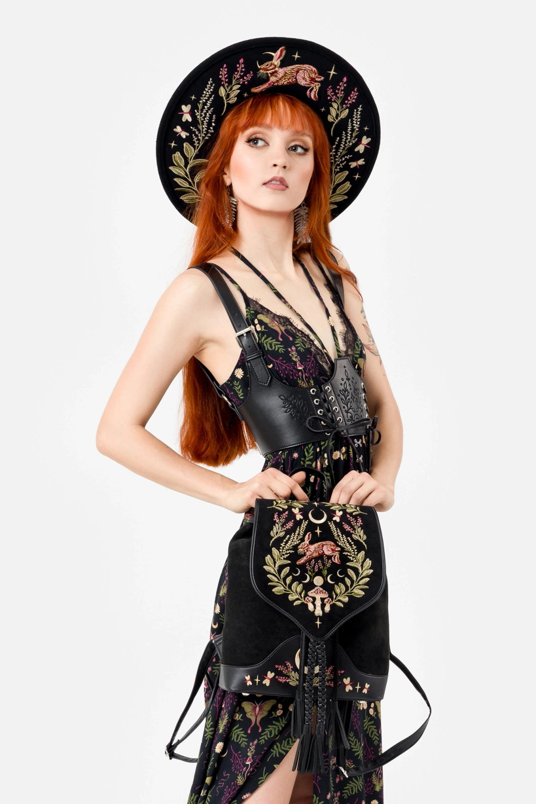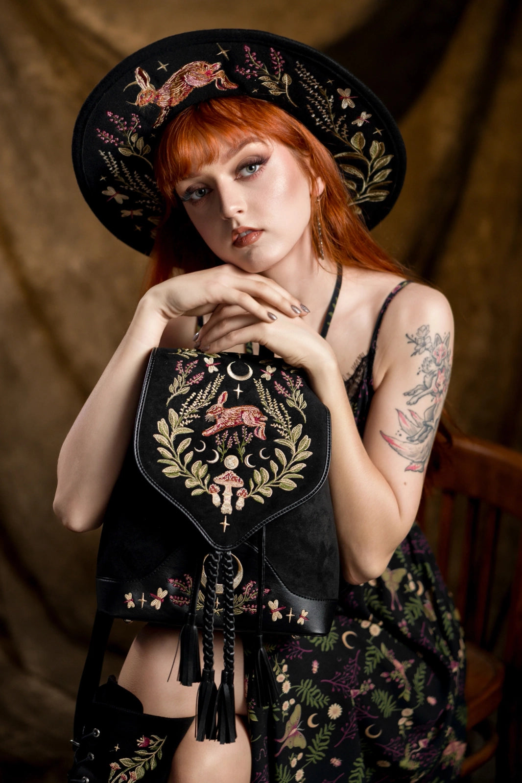 Featuring an embroidered wild hare, dragonflies, and delicate woodland plants, all crafted from black wool. Perfect for those with a witchy soul and a romantic heart ♥