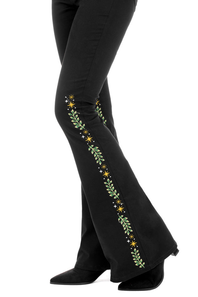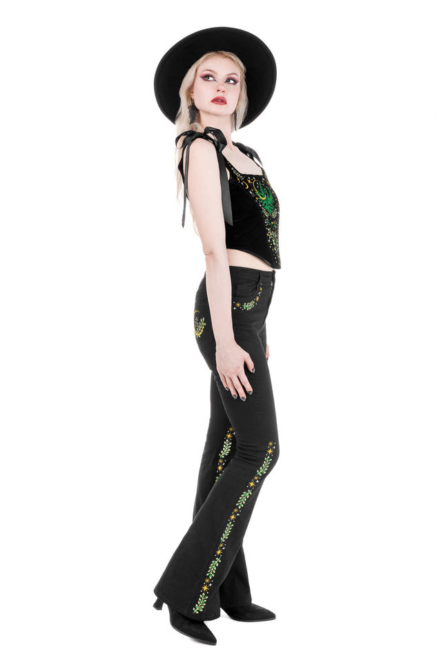Want to channel your inner 90s witch? Embrace the whimsigoth aesthetic with a pair of witchy bell-bottoms featuring intricate herbal embroidery! These black flared jeans are an everyday staple that can be styled in countless ways.