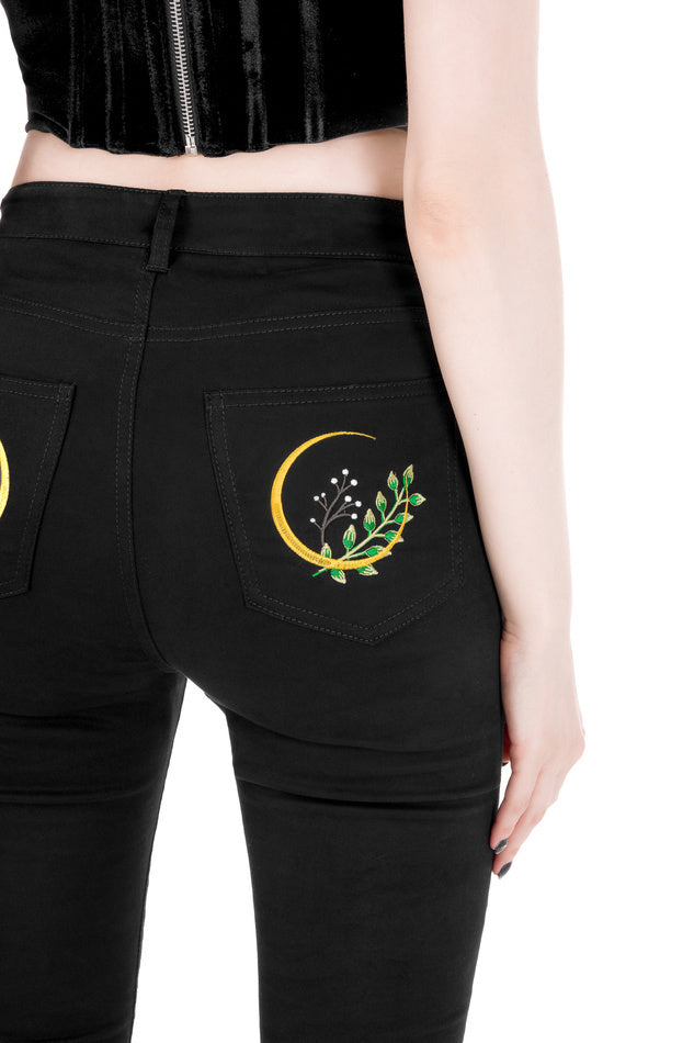 ⋆ Intricate moon & herbal embroidery on the lower legs, front pocket openings, and back pockets