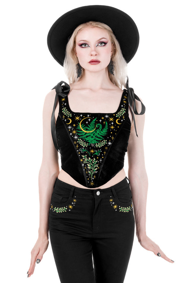 Our Herbal Corset Top is a stunning black botanical bodice meticulously crafted for longevity and timeless style. Each pattern is carefully embroidered, creating a vivid, three-dimensional effect that captures the vibrant essence of a lush forest.