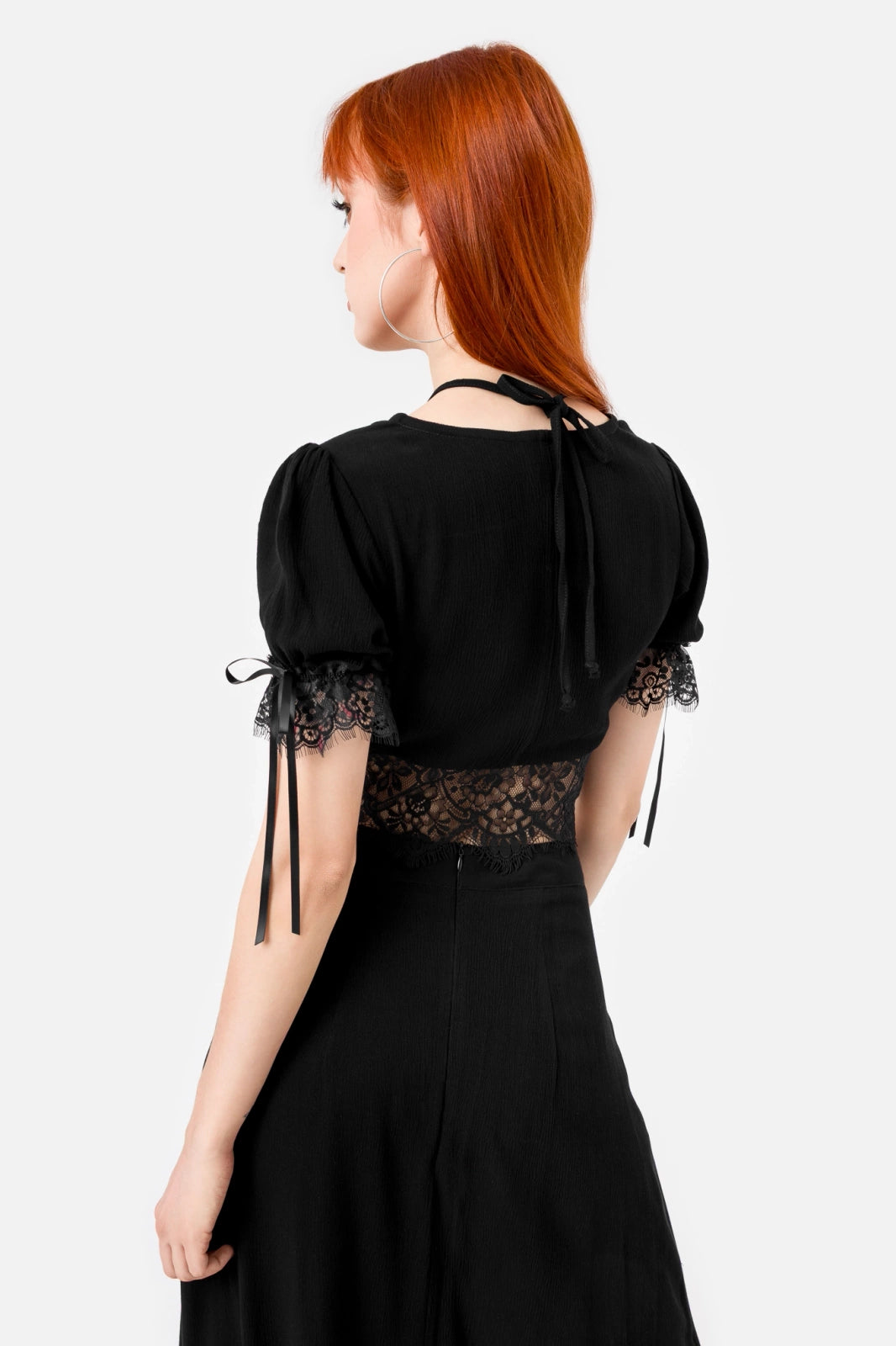✦ Puff sleeves with elasticated hems, trimmed with eyelash lace and adorned with satin bows