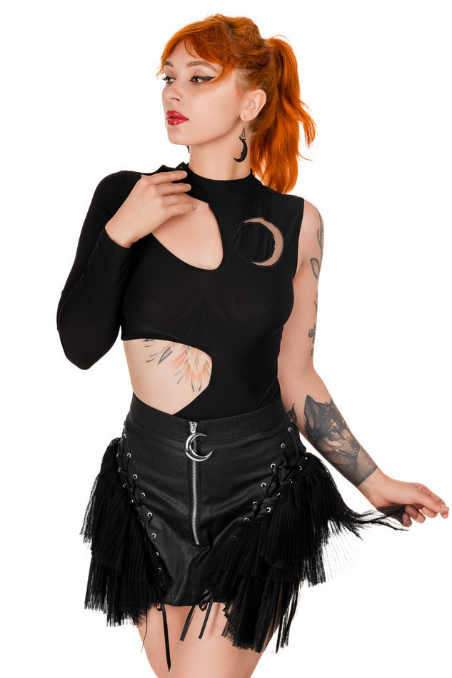 Adorned with corset-style lacing and a crescent moon motif zipper, the ensemble exudes a unique charm. The skirt is mini in length, encapsulating the spirit of the 80s, yet reimagined in a modern and bolder interpretation. This skirt is your canvas, and as you wear it, you're the artist of your own narrative, painting a picture of confidence and audacity.