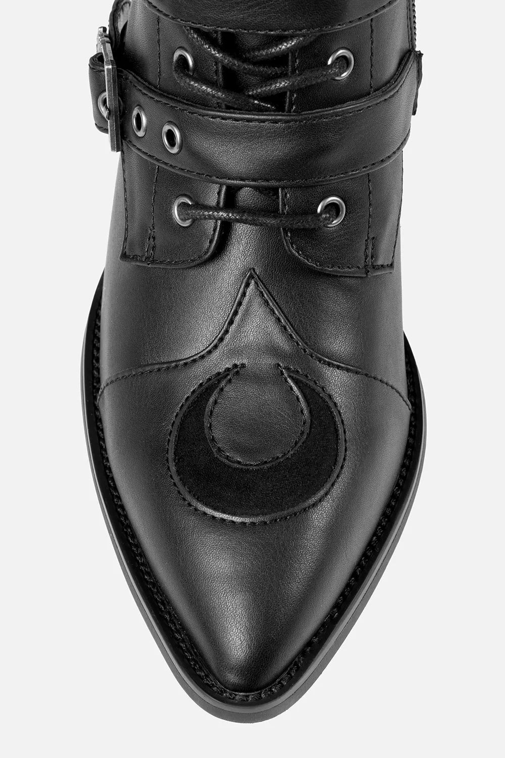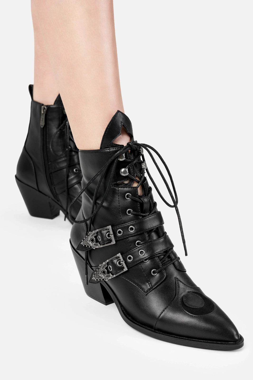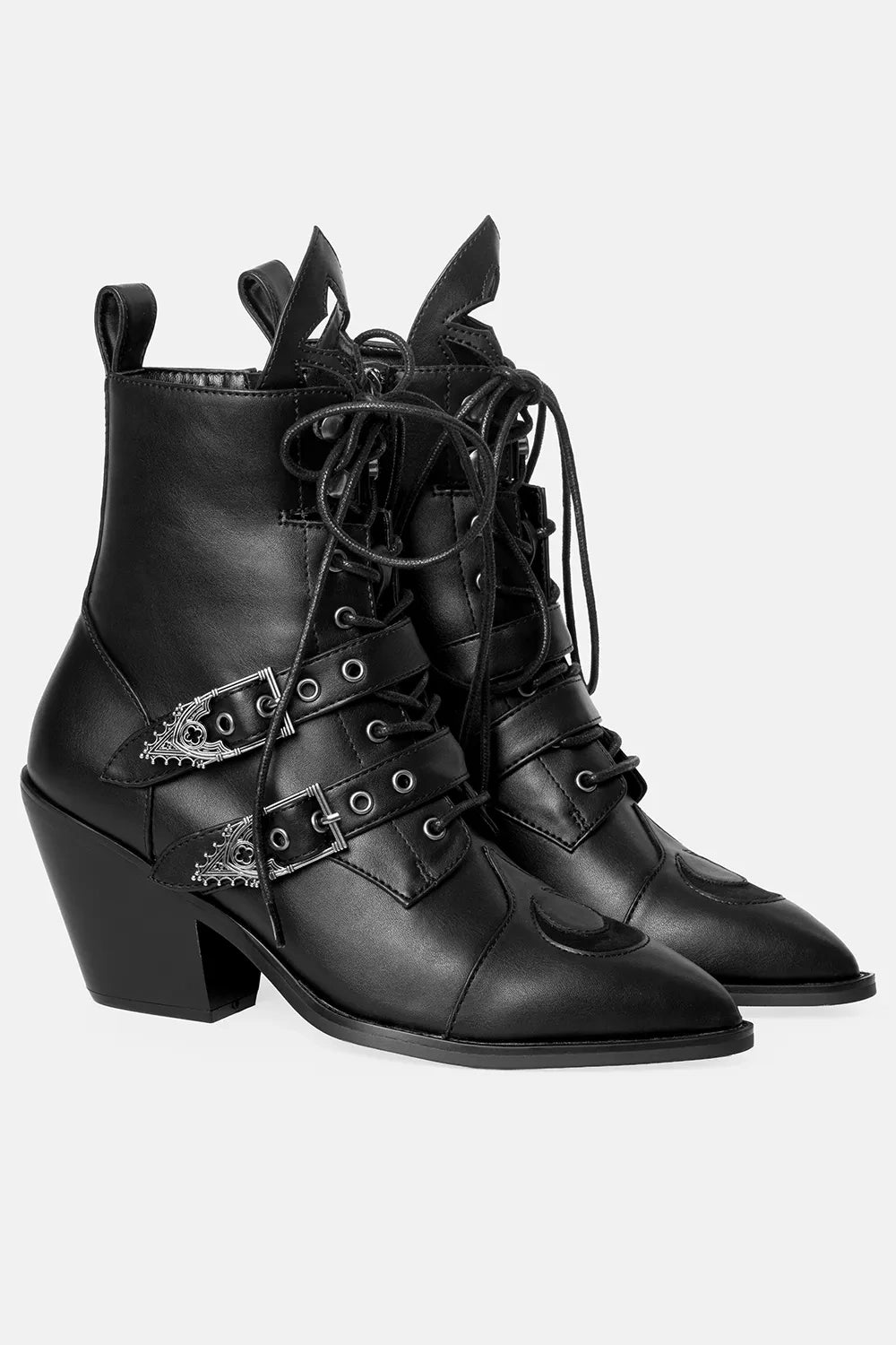 The Moonstruck Boots are gothic ankle boots with architectural detail and celestial flair. Made from sleek PU leather, they feature cathedral tracery cut-outs, crescent moon toes, and spire-style buckle straps. Built to be styled your way, they offer two distinct looks — lace them up fully for a classic silhouette, or wrap the laces at the ankle to reveal the pointed tongue and detailed cut-outs.
