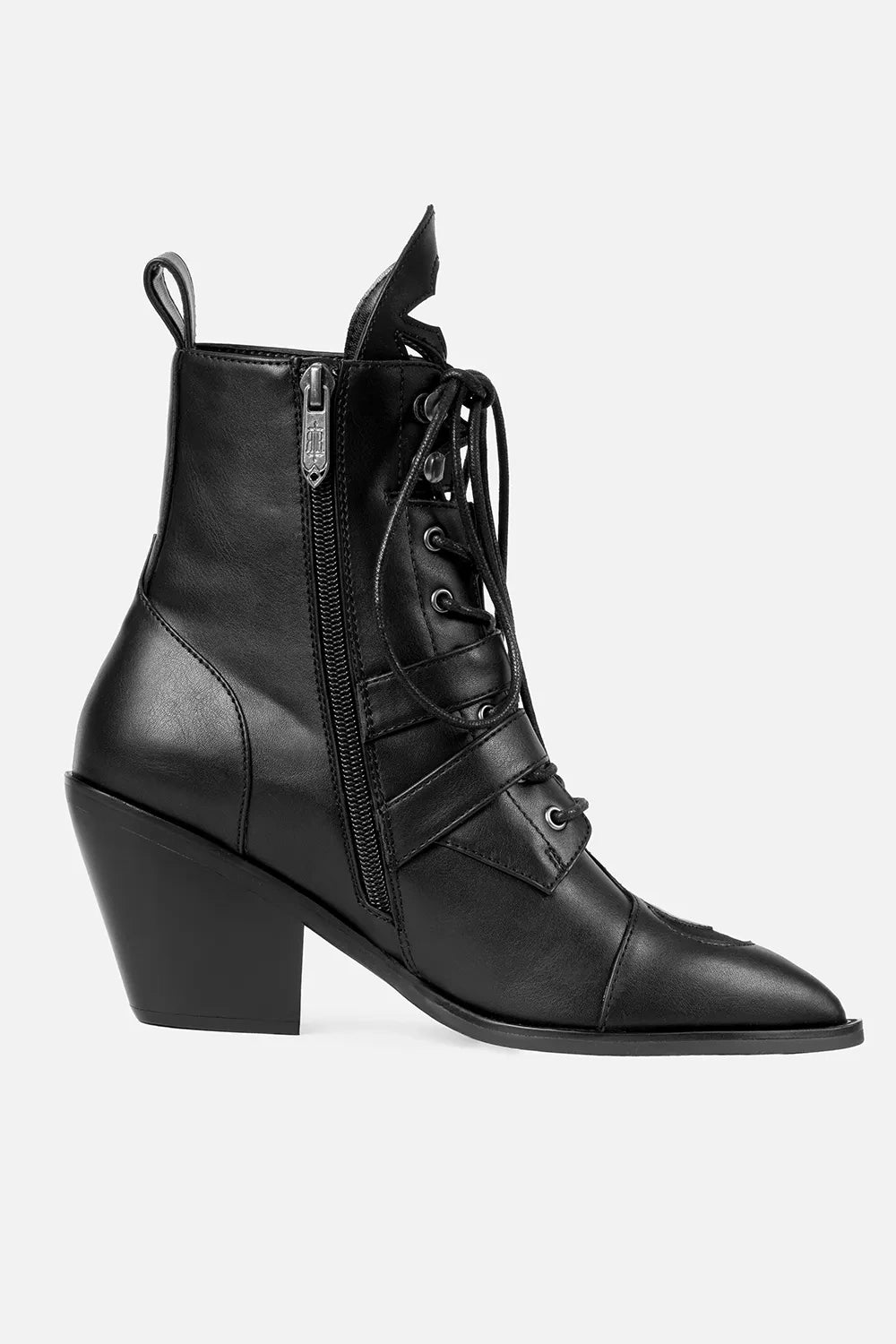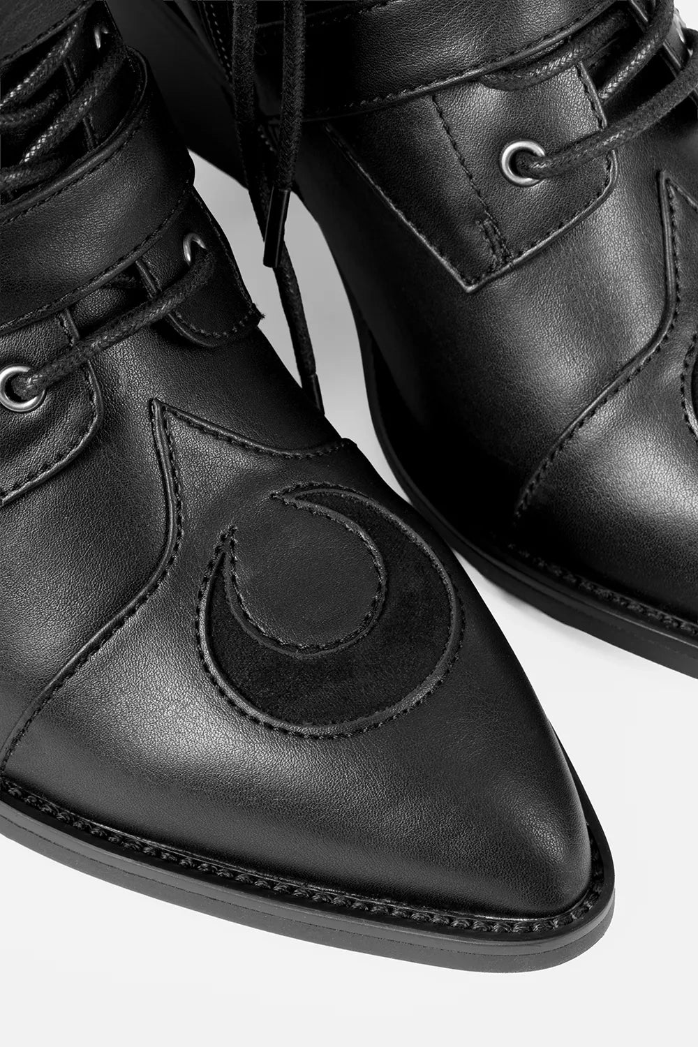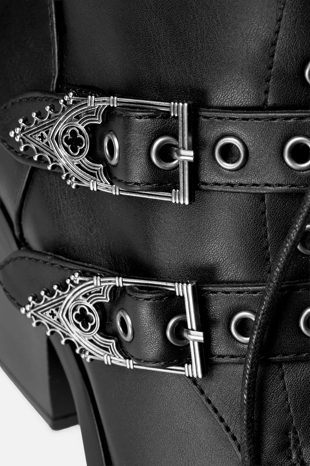 The Moonstruck Boots are gothic ankle boots with architectural detail and celestial flair. Made from sleek PU leather, they feature cathedral tracery cut-outs, crescent moon toes, and spire-style buckle straps. Built to be styled your way, they offer two distinct looks — lace them up fully for a classic silhouette, or wrap the laces at the ankle to reveal the pointed tongue and detailed cut-outs.