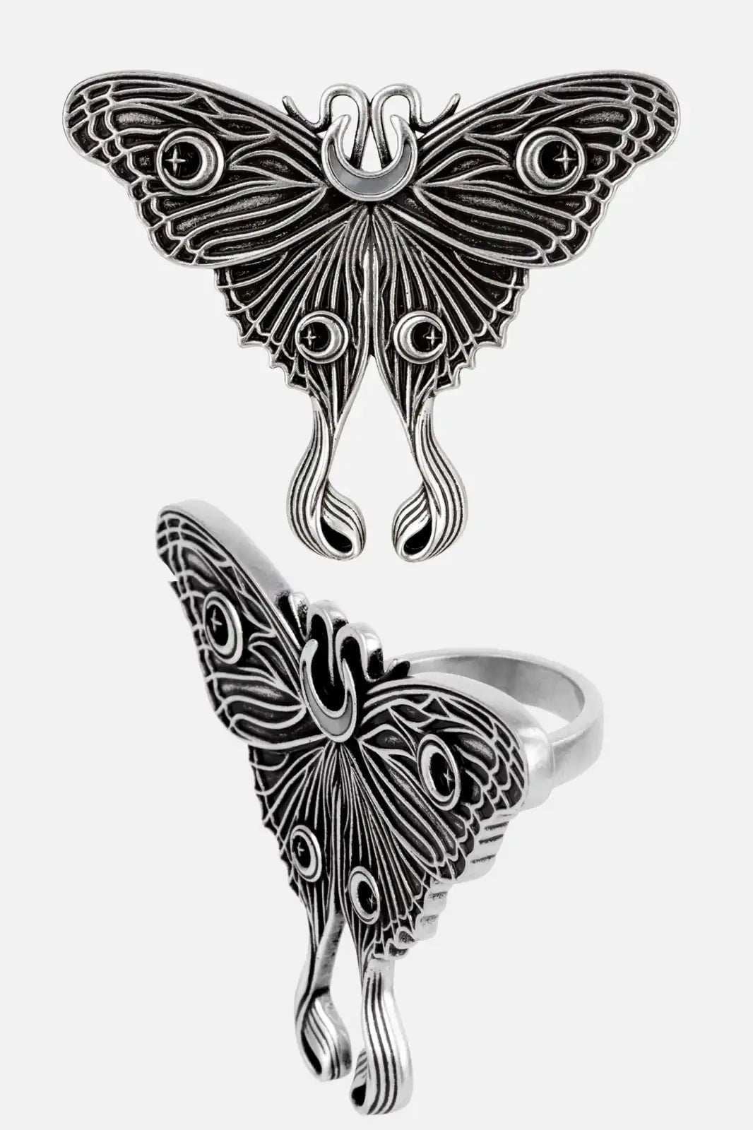 A custom sculpted moth spreads its wings wide, featuring a shimmering white mother of pearl inlay shaped like a crescent moon. This oversized ring is a captivating centerpiece full of gothic charm and natural elegance.