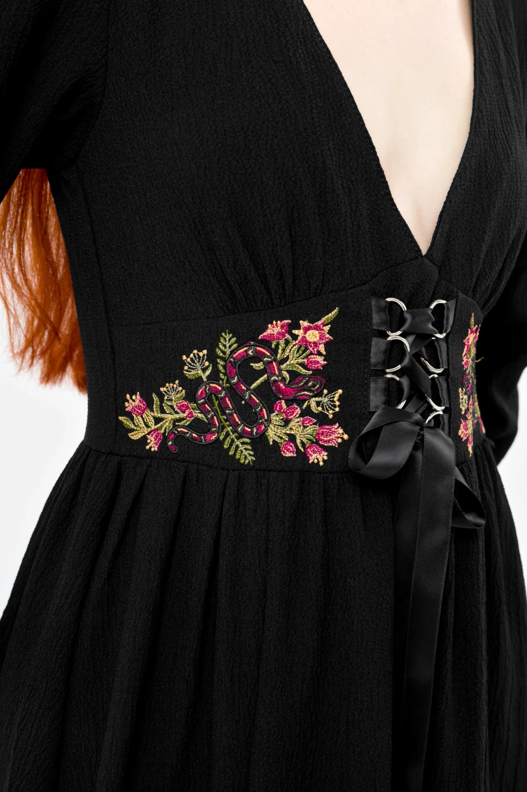 For the witches, seers, and forest spirits – beings woven from magic, mystery, and ancient lore. Adorned with stunning embroidery of serpents and wild plants, the Poisoned Petal Midi Dress is a truly spellbinding piece ♥