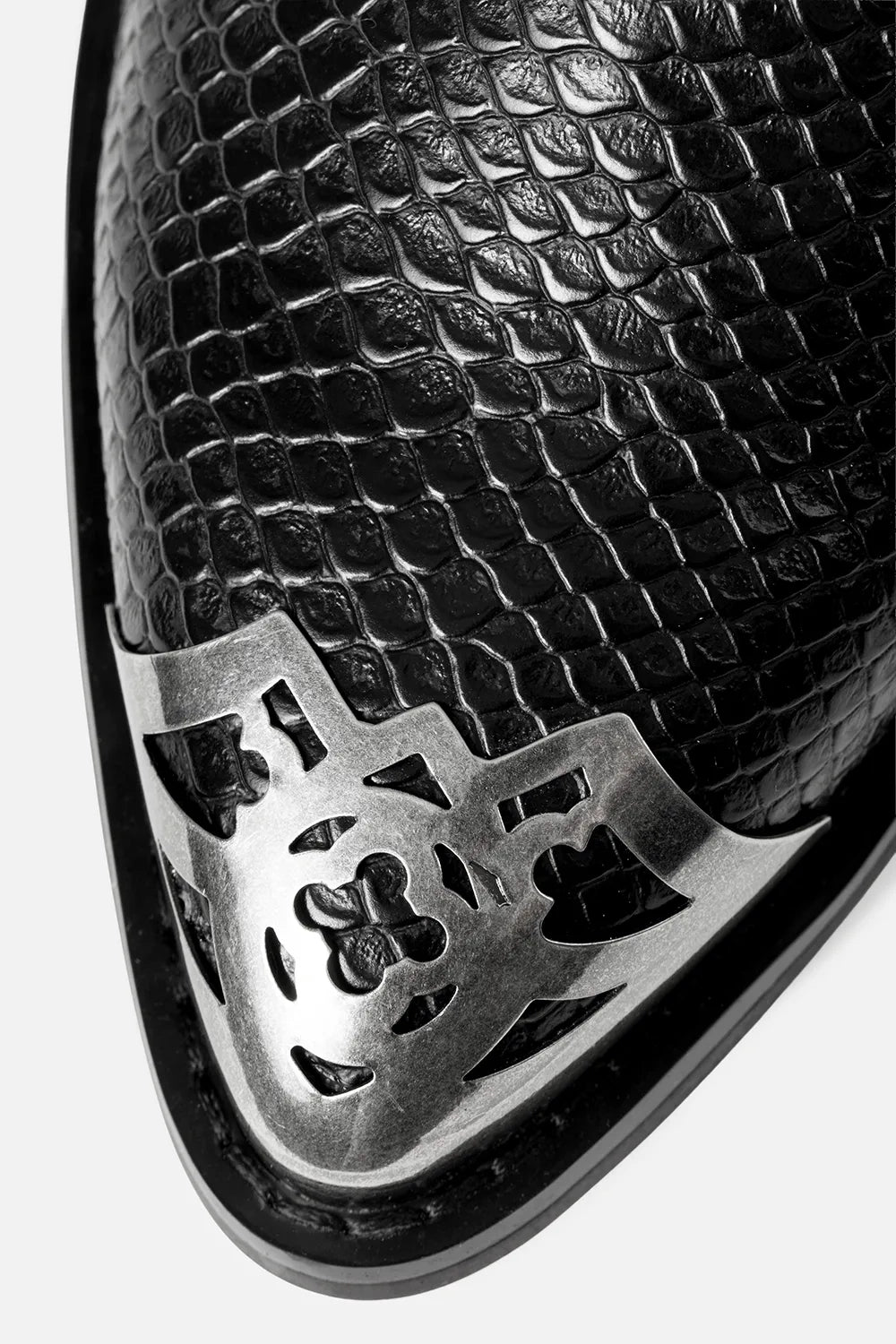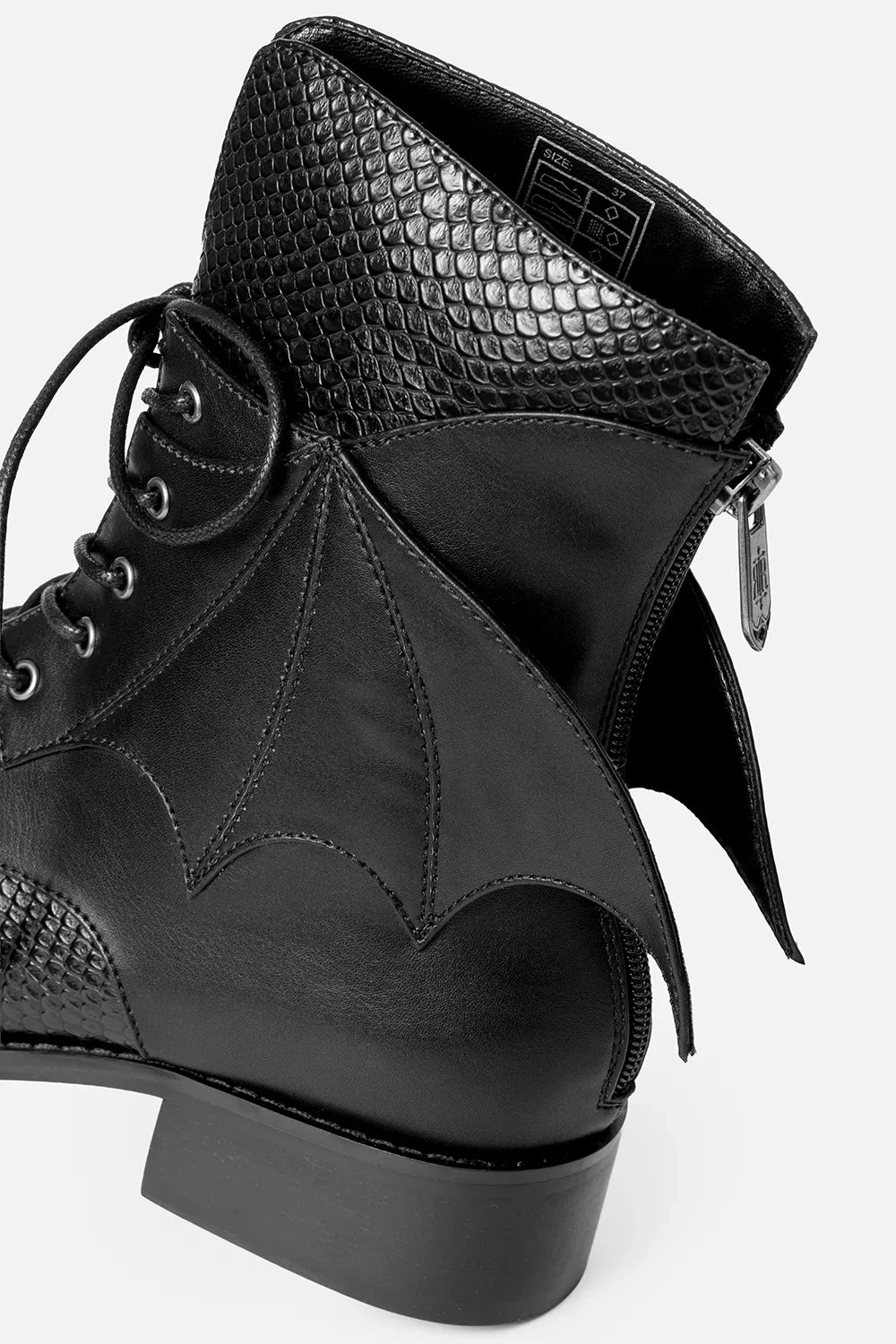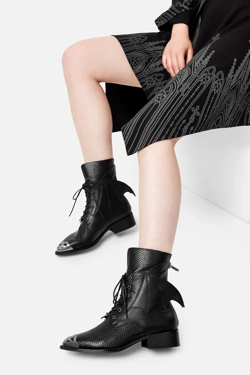 The Shadow Wing Pikes are bold, sculptural, and unapologetically goth. Made from contrasting snakeskin-effect and smooth PU leather, these low heel gothic pikes feature dramatic 3D bat wings that curve from the ankle. A custom cathedral-style metal toe cap adds sharp elegance, finished in antique silver.