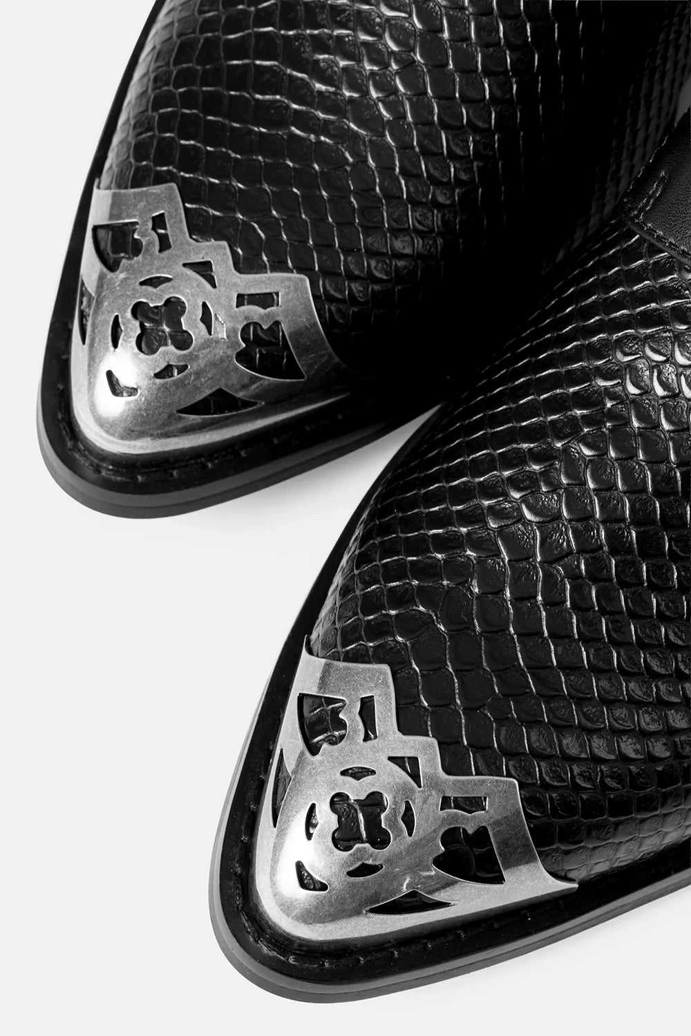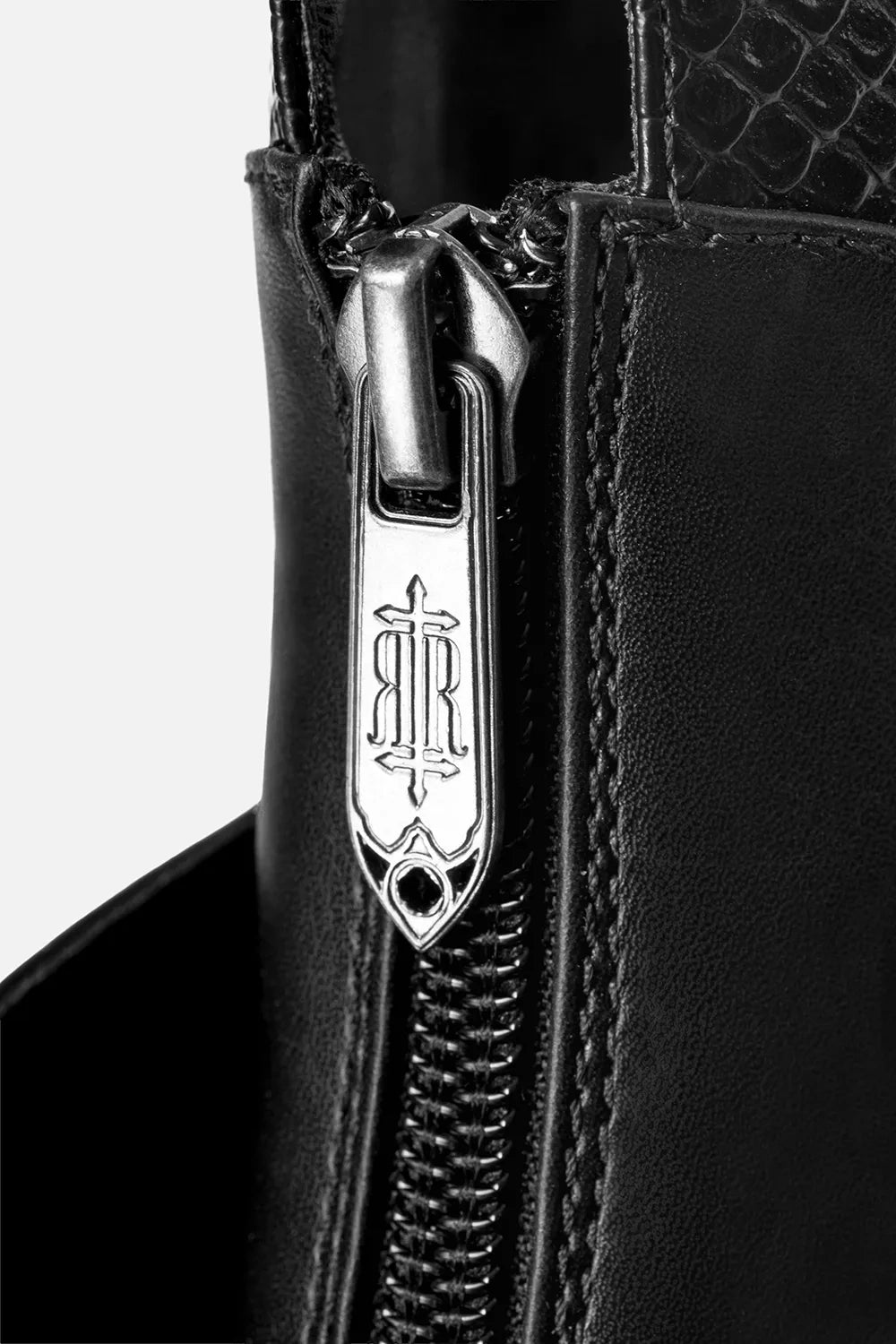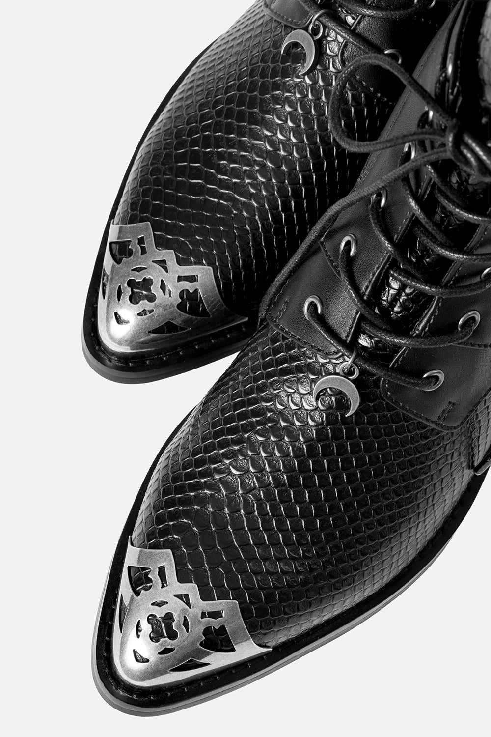 The Shadow Wing Pikes are bold, sculptural, and unapologetically goth. Made from contrasting snakeskin-effect and smooth PU leather, these low heel gothic pikes feature dramatic 3D bat wings that curve from the ankle. A custom cathedral-style metal toe cap adds sharp elegance, finished in antique silver.