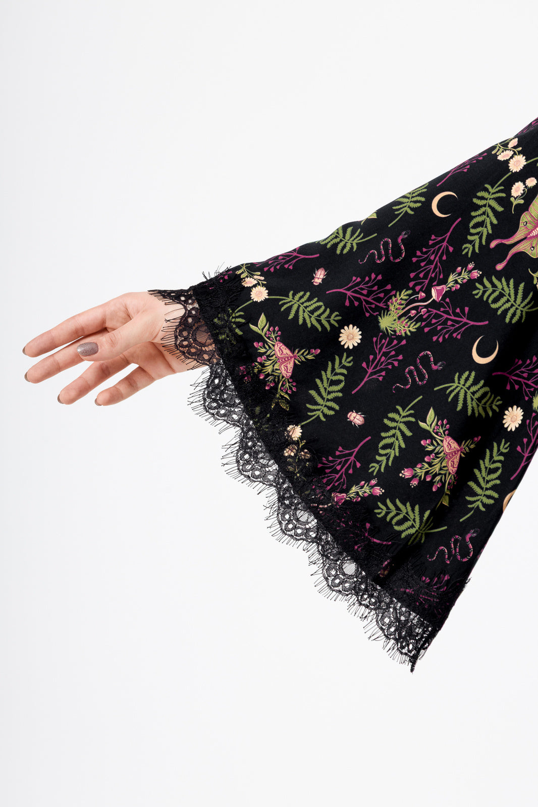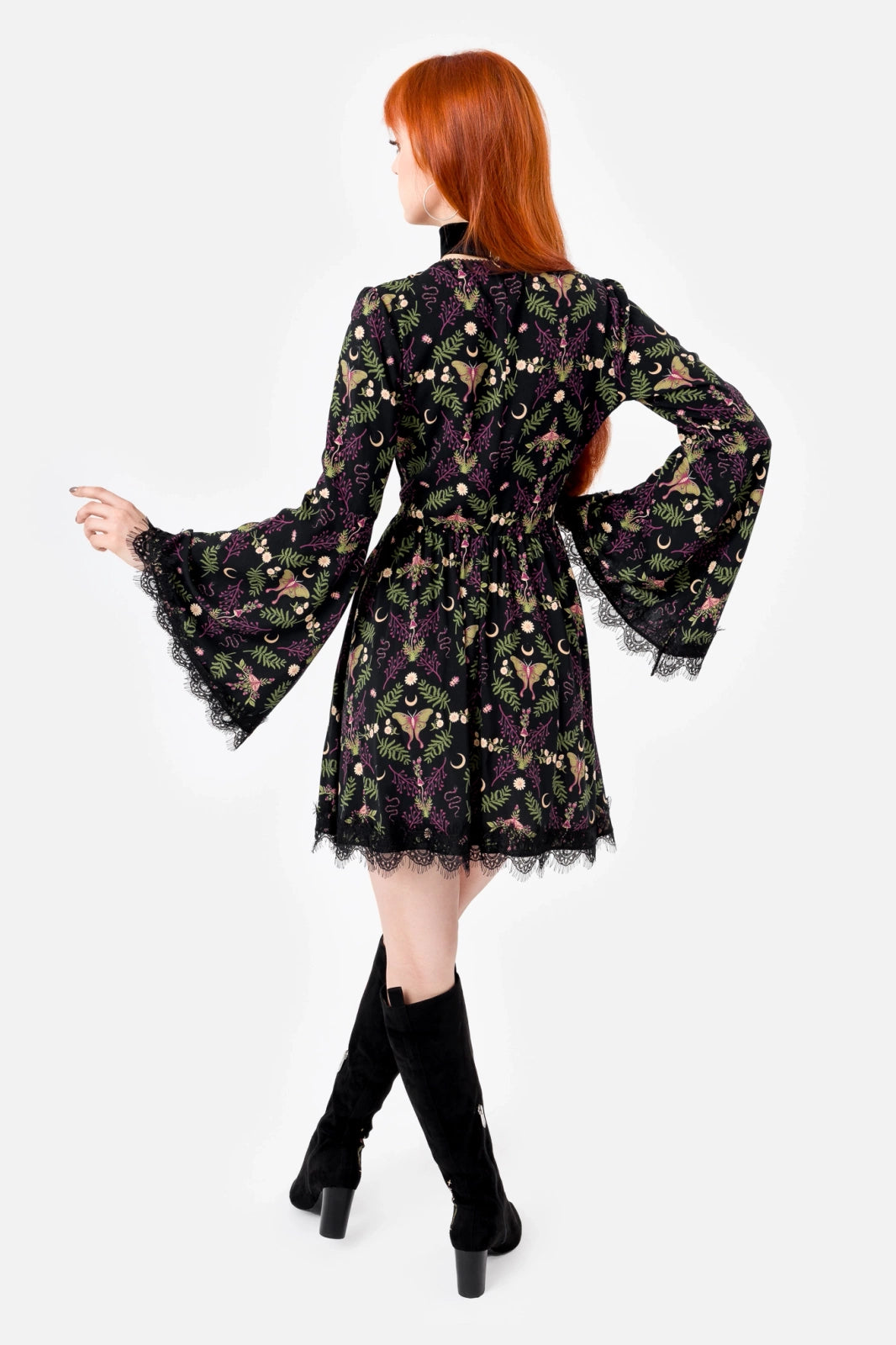 The Wilderwood Mini Dress is adorned with delicate moths, snakes, and wild flora  symbols of transformation and the unseen. Perfect for those who find beauty in the darkness and whose souls are as untamed as the whispering woods.