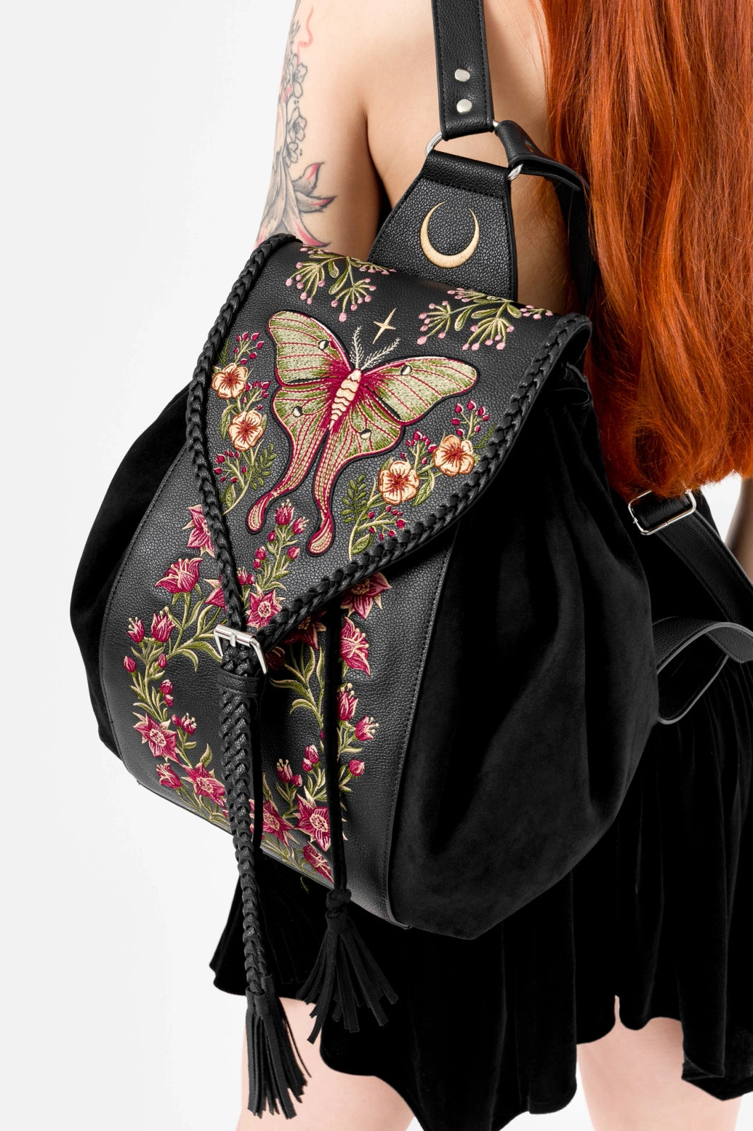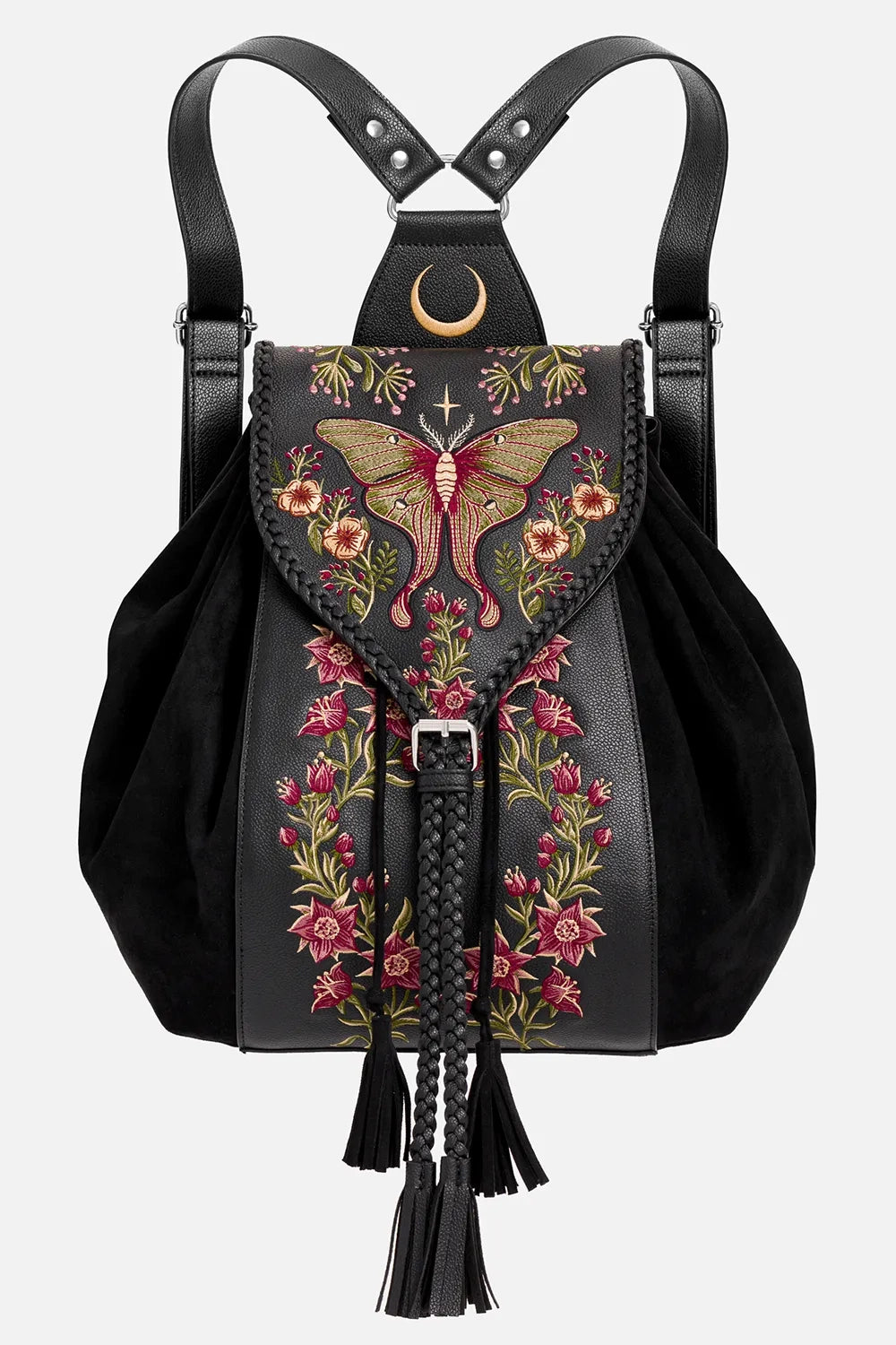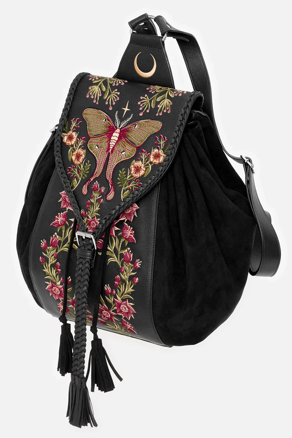 This nature-meets-moonlight backpack combines soft and structured textures with floral and moth embroidery, a moonlit D-ring panel, and charming tassels. Braided trims add a touch of folk charm. Whether you're off to class, the woods, or a café – you'll want this by your side!