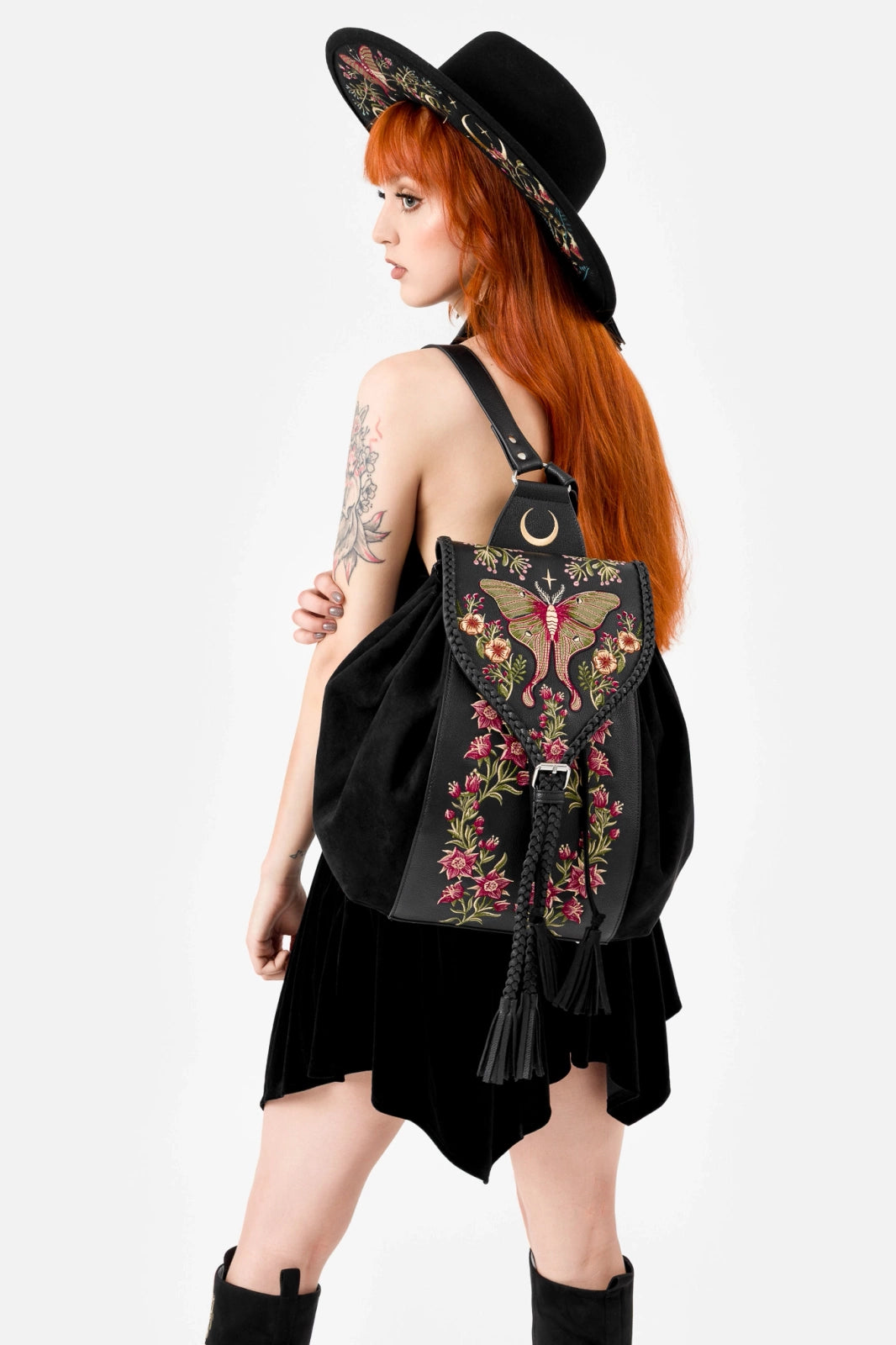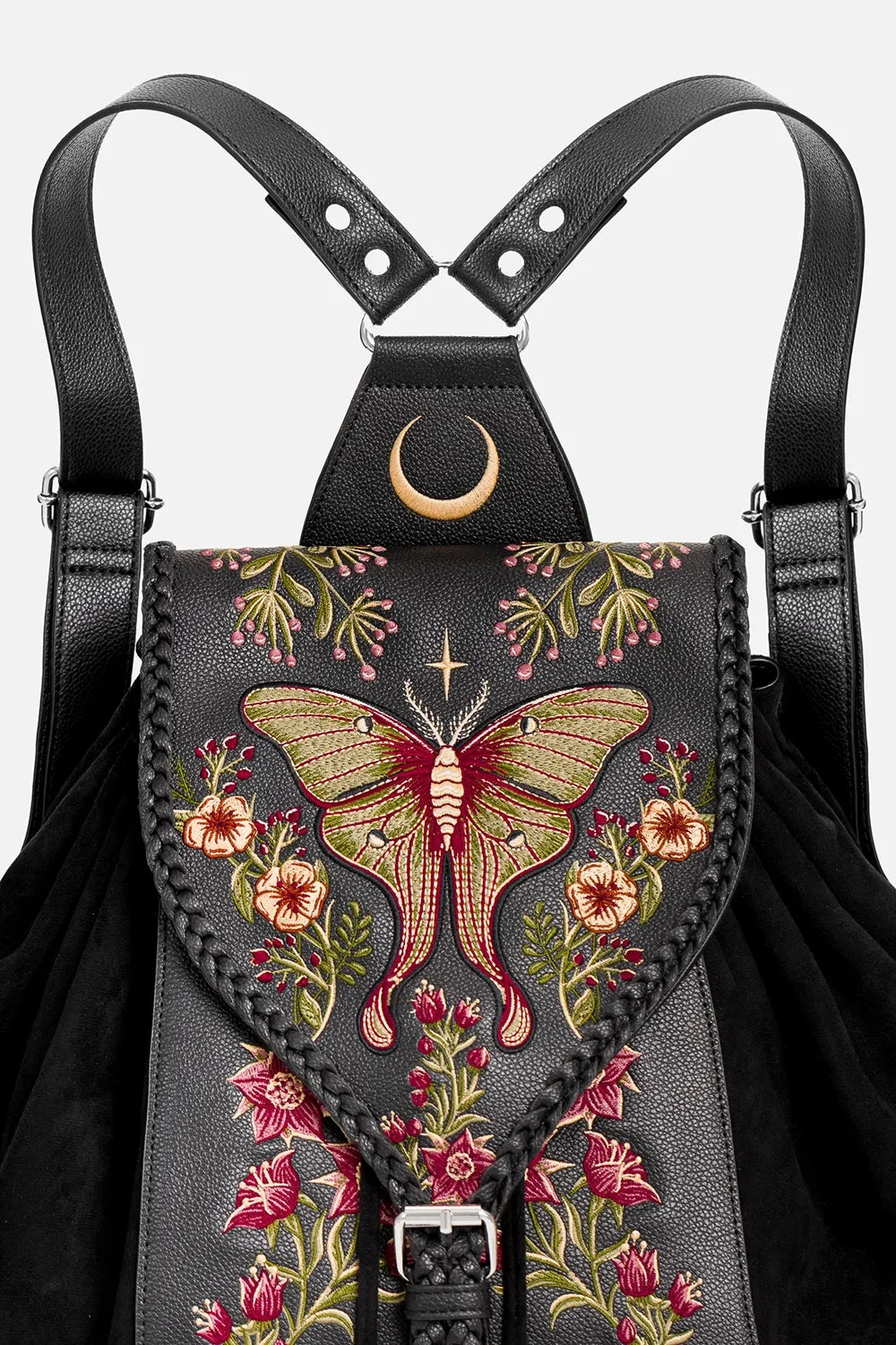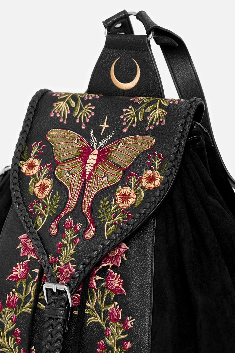 This nature-meets-moonlight backpack combines soft and structured textures with floral and moth embroidery, a moonlit D-ring panel, and charming tassels. Braided trims add a touch of folk charm. Whether you're off to class, the woods, or a café – you'll want this by your side!