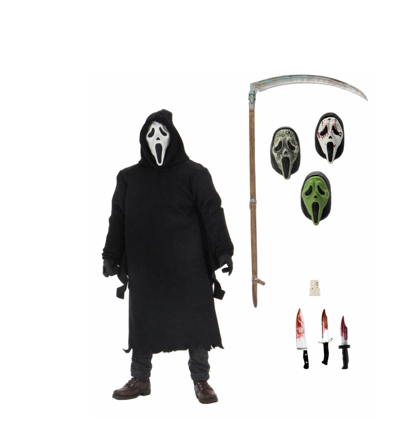 NECA is proud to announce one of the greatest slashers to come out of the 90s is joining the Ultimate line! Ghostface stands approximately 7" tall, is dressed in an all fabric robe for full pose ability, and comes with a disturbing amount of sharp objects including 3 knives and a scythe.