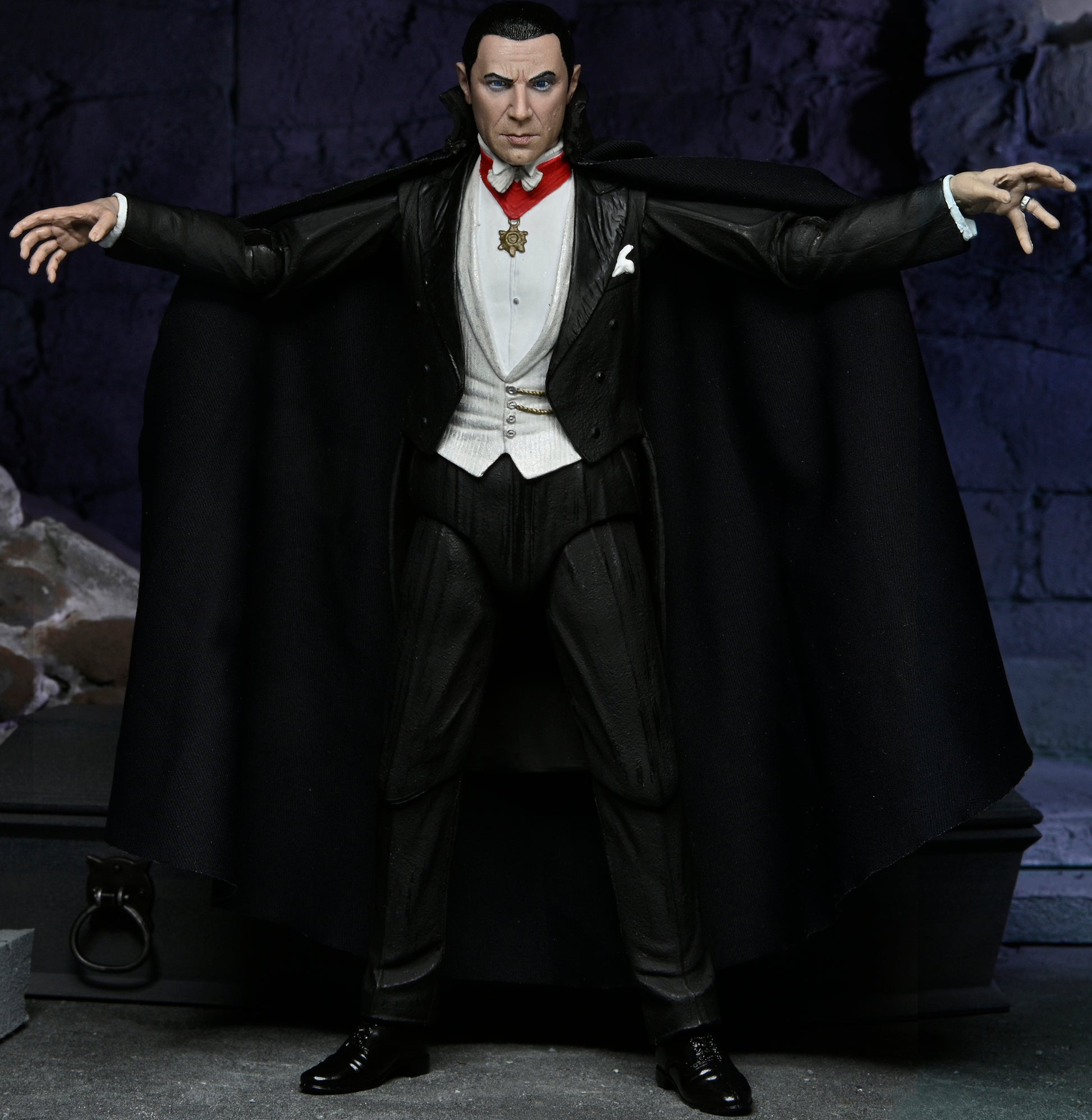 Following the color version, we’ve created a special black-and-white figure that features the formal tuxedo seen at his Carfax estate. We worked closely with the estate of Bela Lugosi to capture the actor’s expressive likeness and for additional background detail on important costume elements. Standing in 7” scale, the Ultimate Dracula (Carfax Abbey) action figure has a removable soft goods cape and comes with plenty of accessories: top hat, cane, bat, flight stand, plus three interchangeable heads and hands.