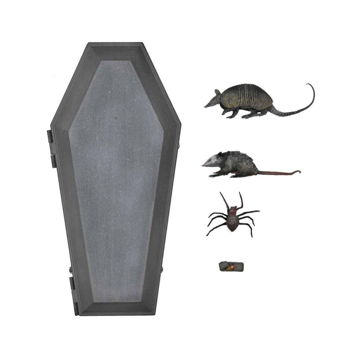 Build even bigger scenes and dioramas with this accessory set for NECA’s Universal Monsters Dracula action figure! The centerpiece of the set is the large coffin, which measures almost 9” inches long and opens to fit your Dracula figure inside (figure sold separately). The set also includes armadillo, large spider, cricket in coffin, and opossum accessories.